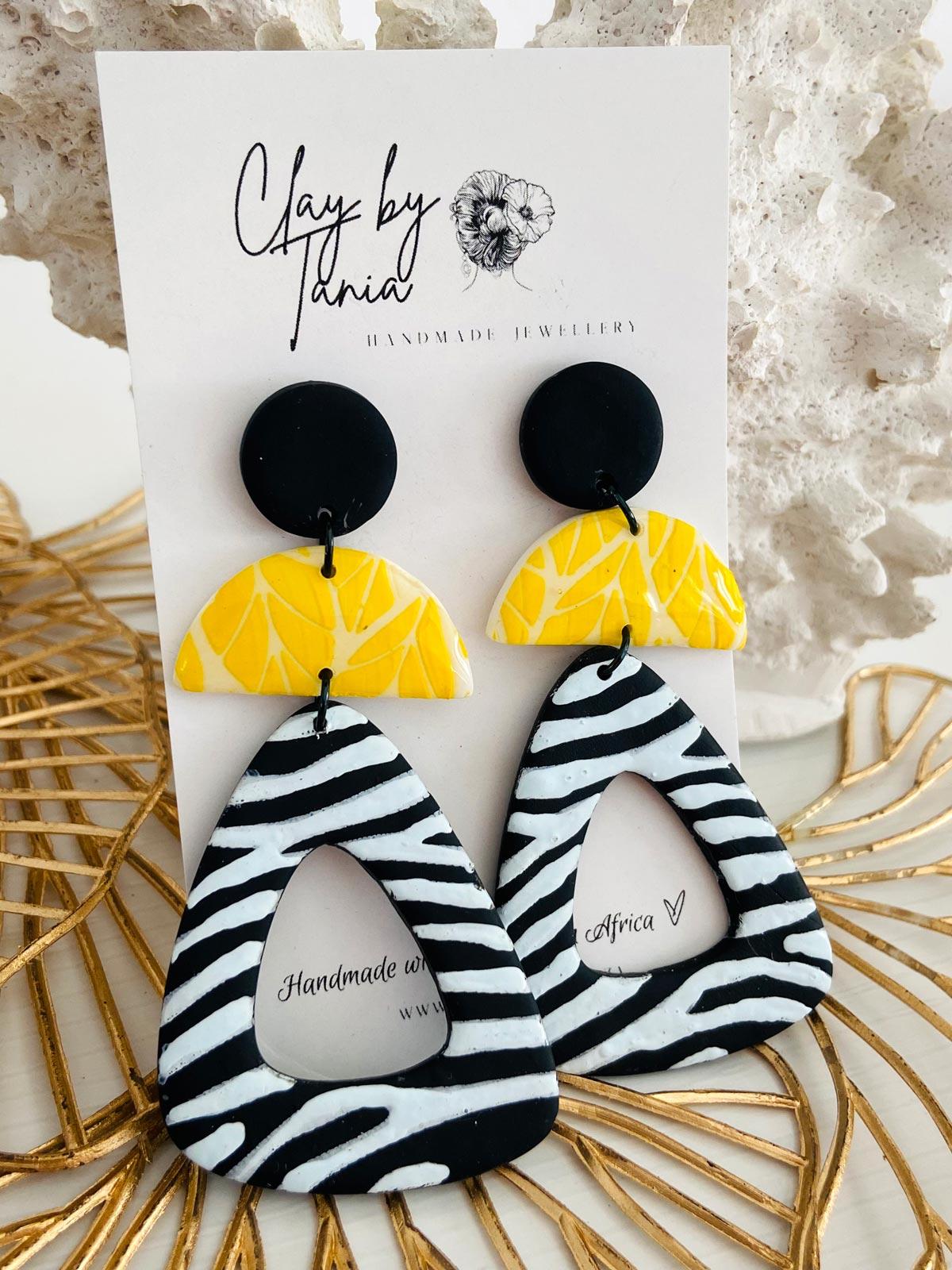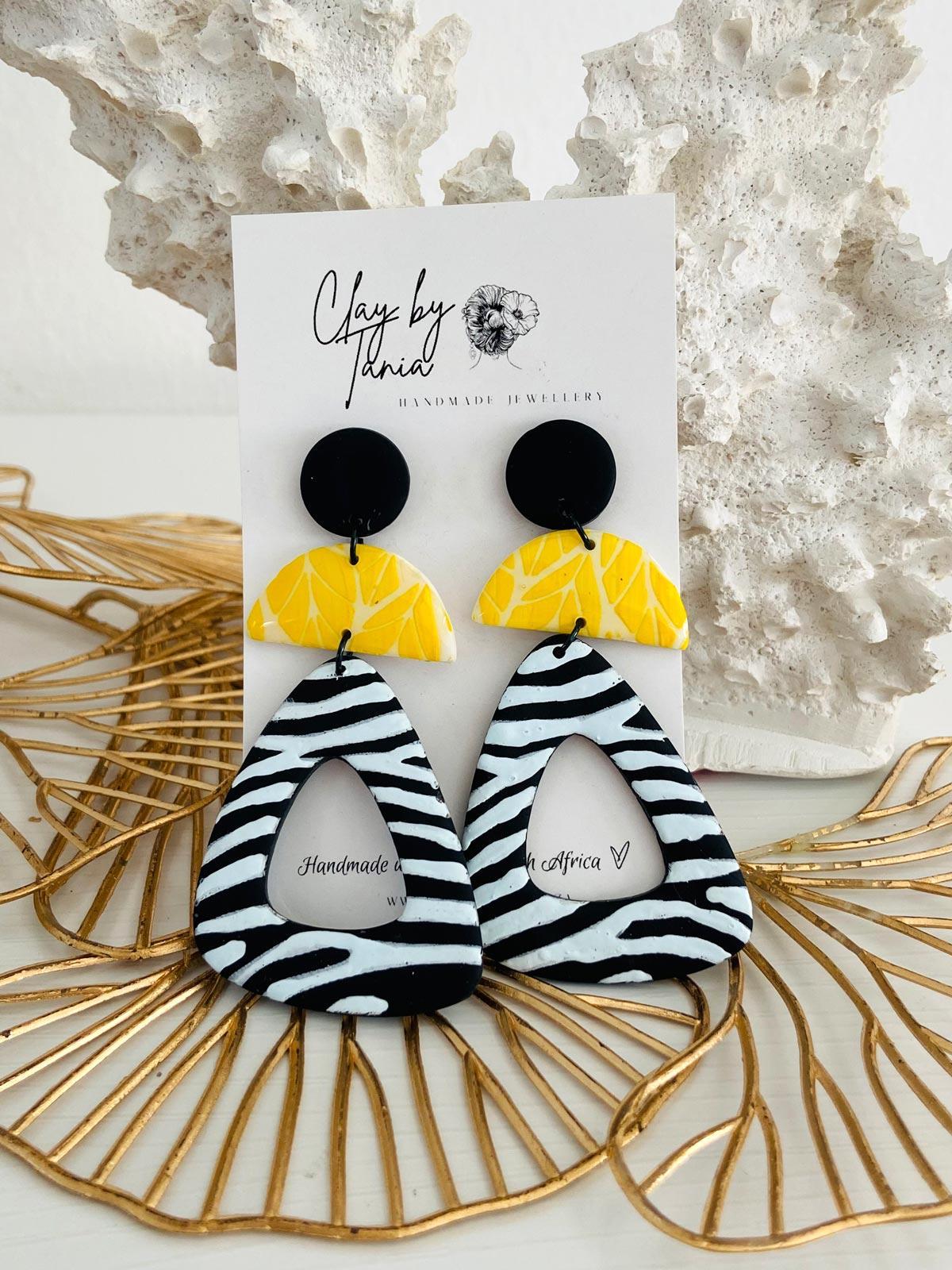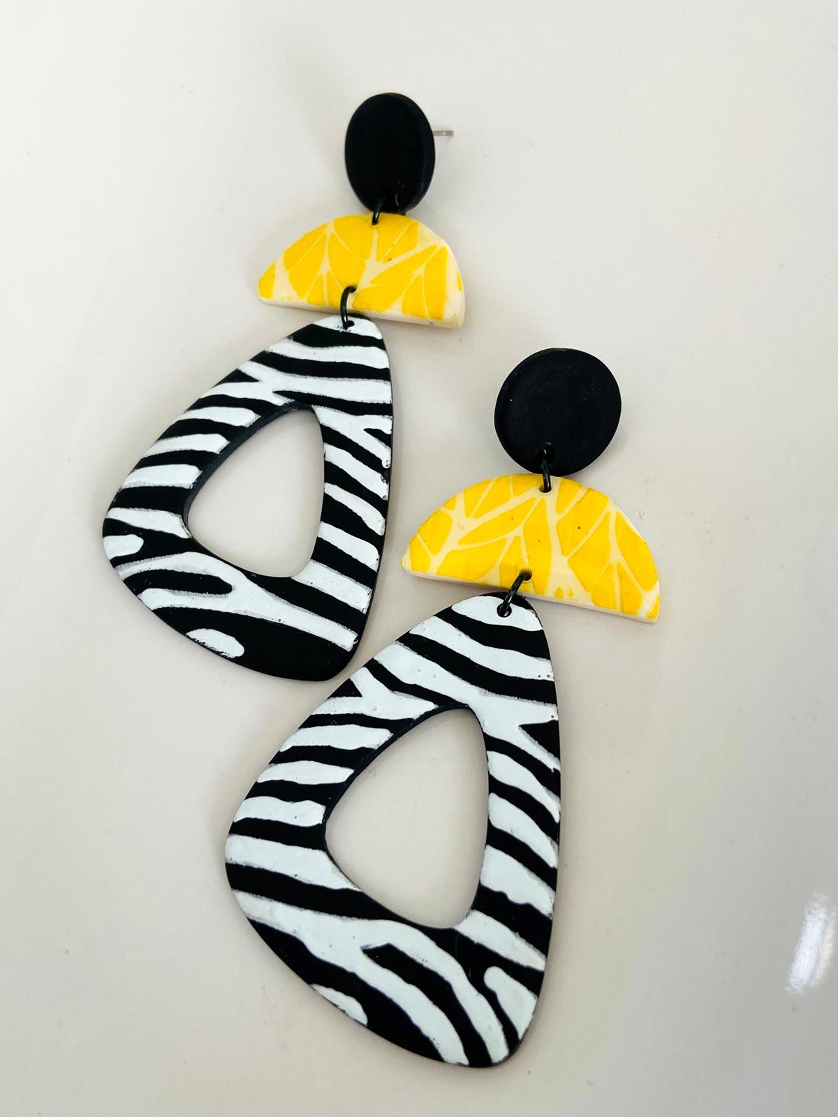 Colour/s: Black, white, yellow. Round stud with yellow leaf effect and zebra print