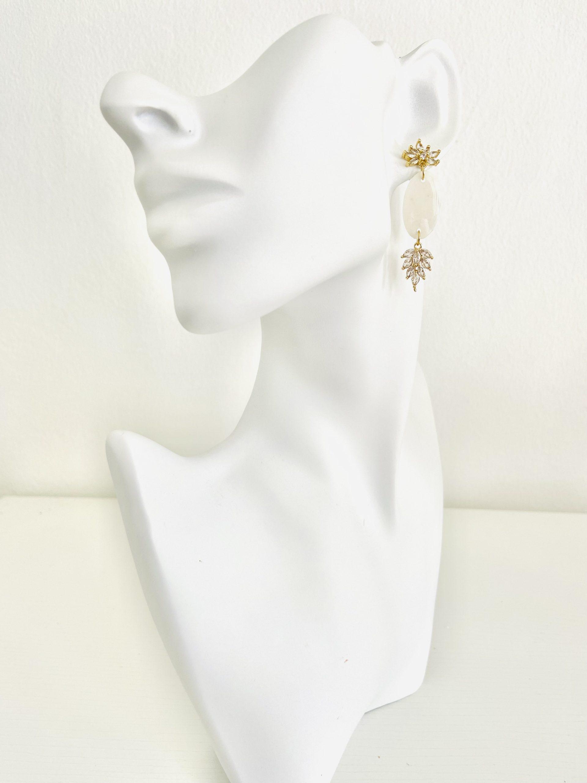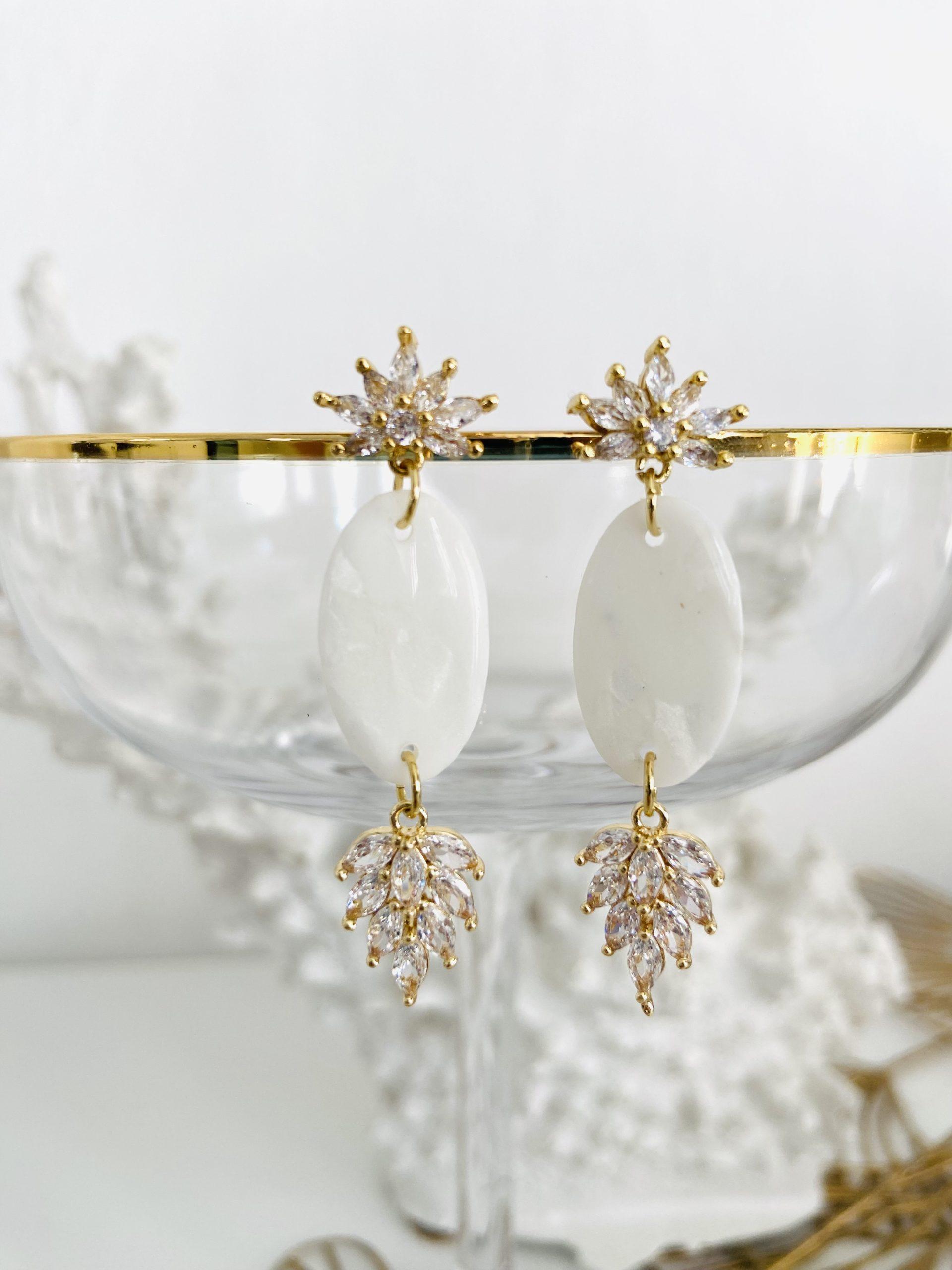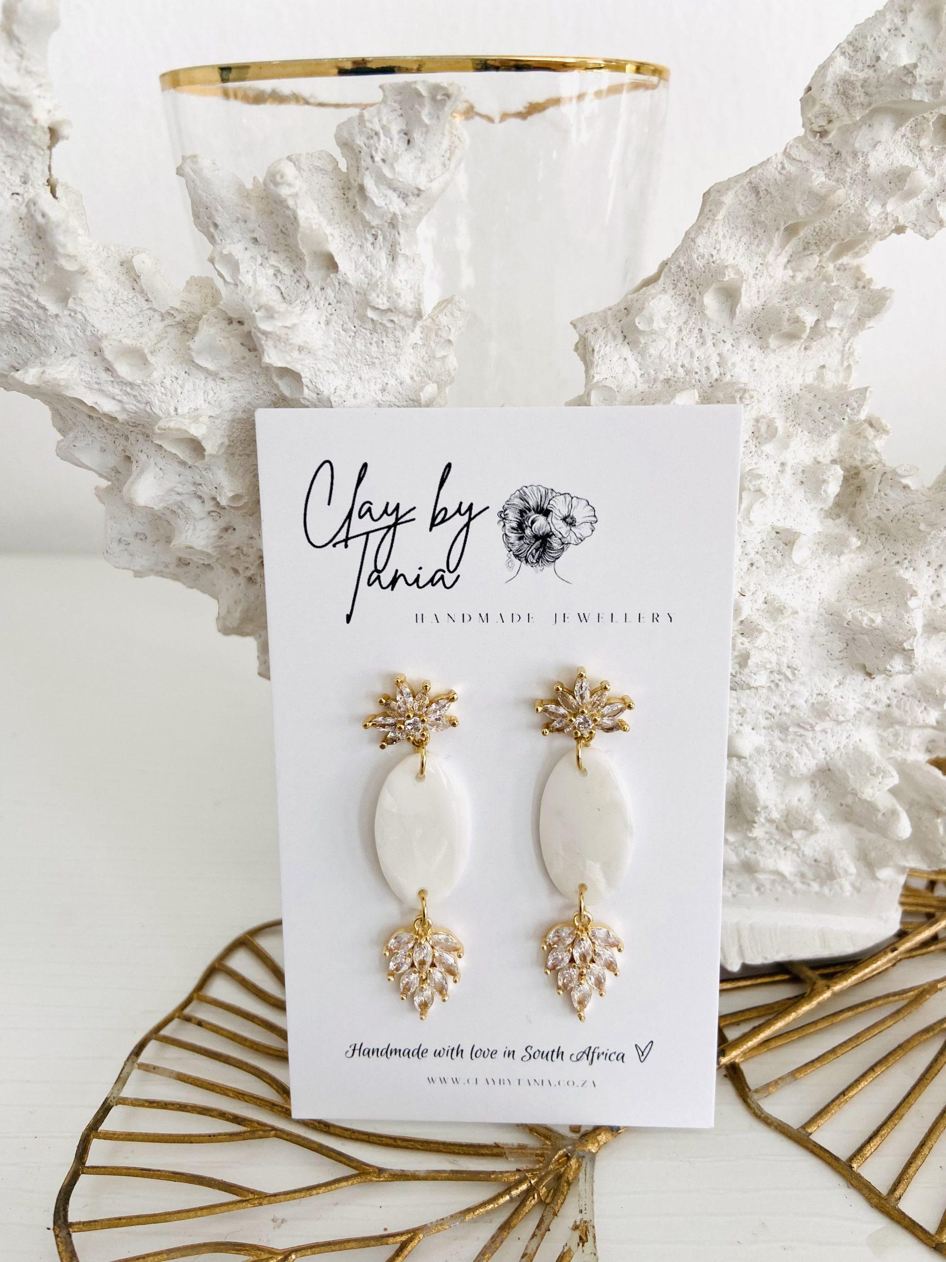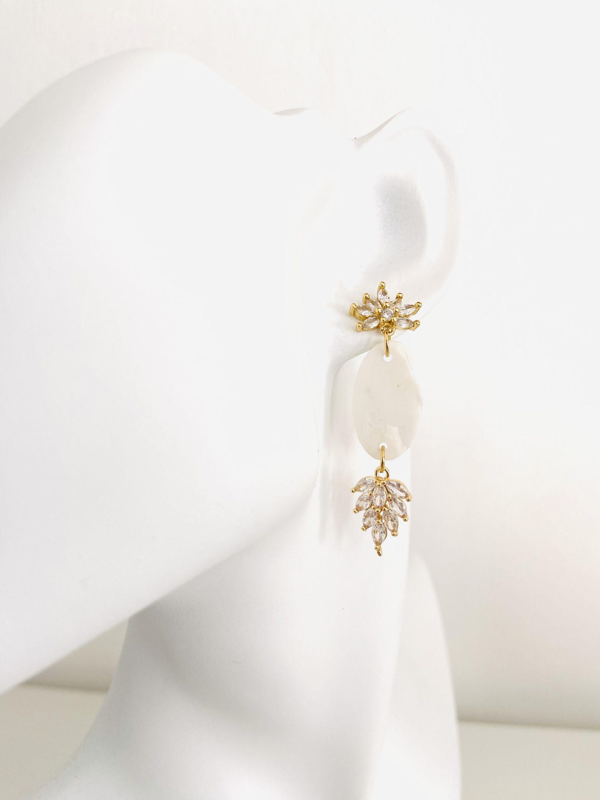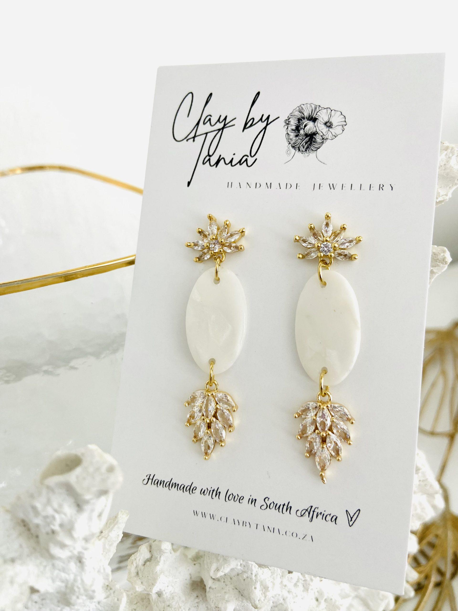 Gold cubic zirconia flower stud with white polymer clay oval and 18ct gold-plated cubic zirconia leaf pendant.