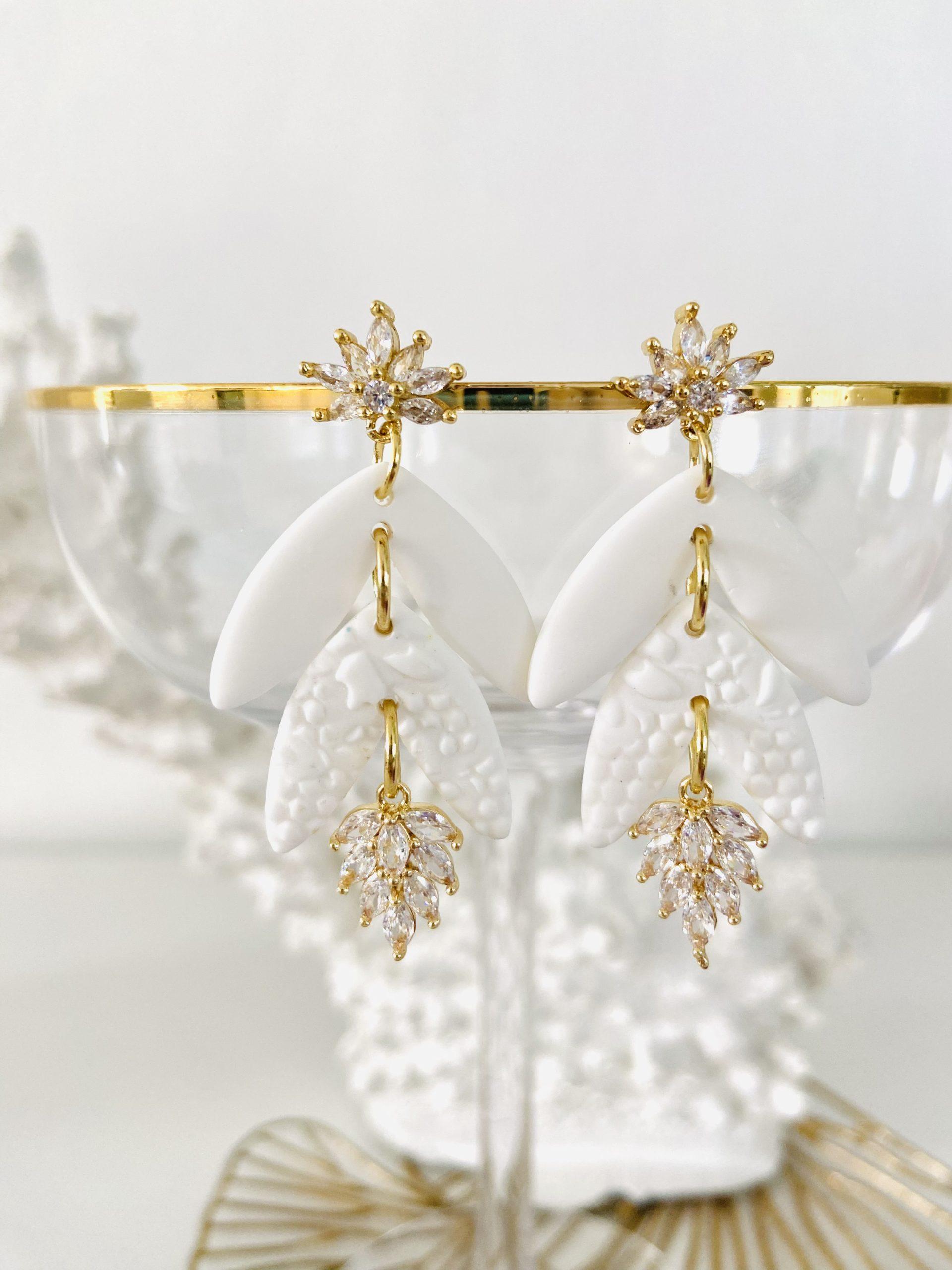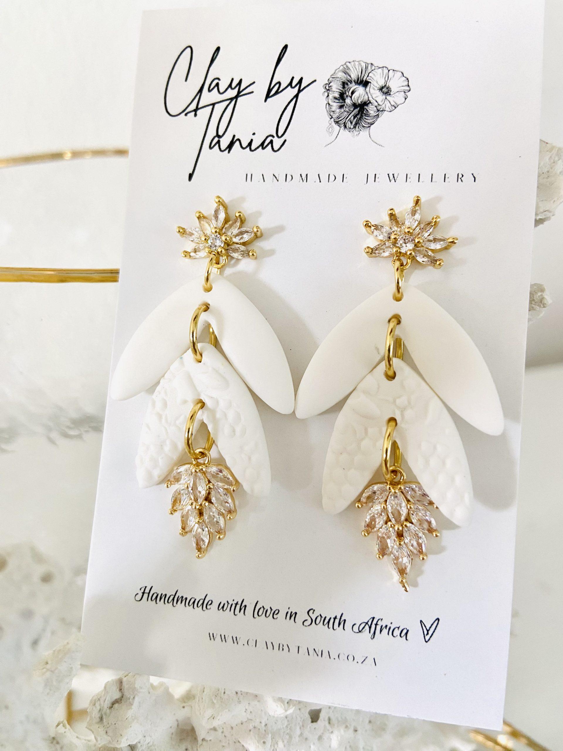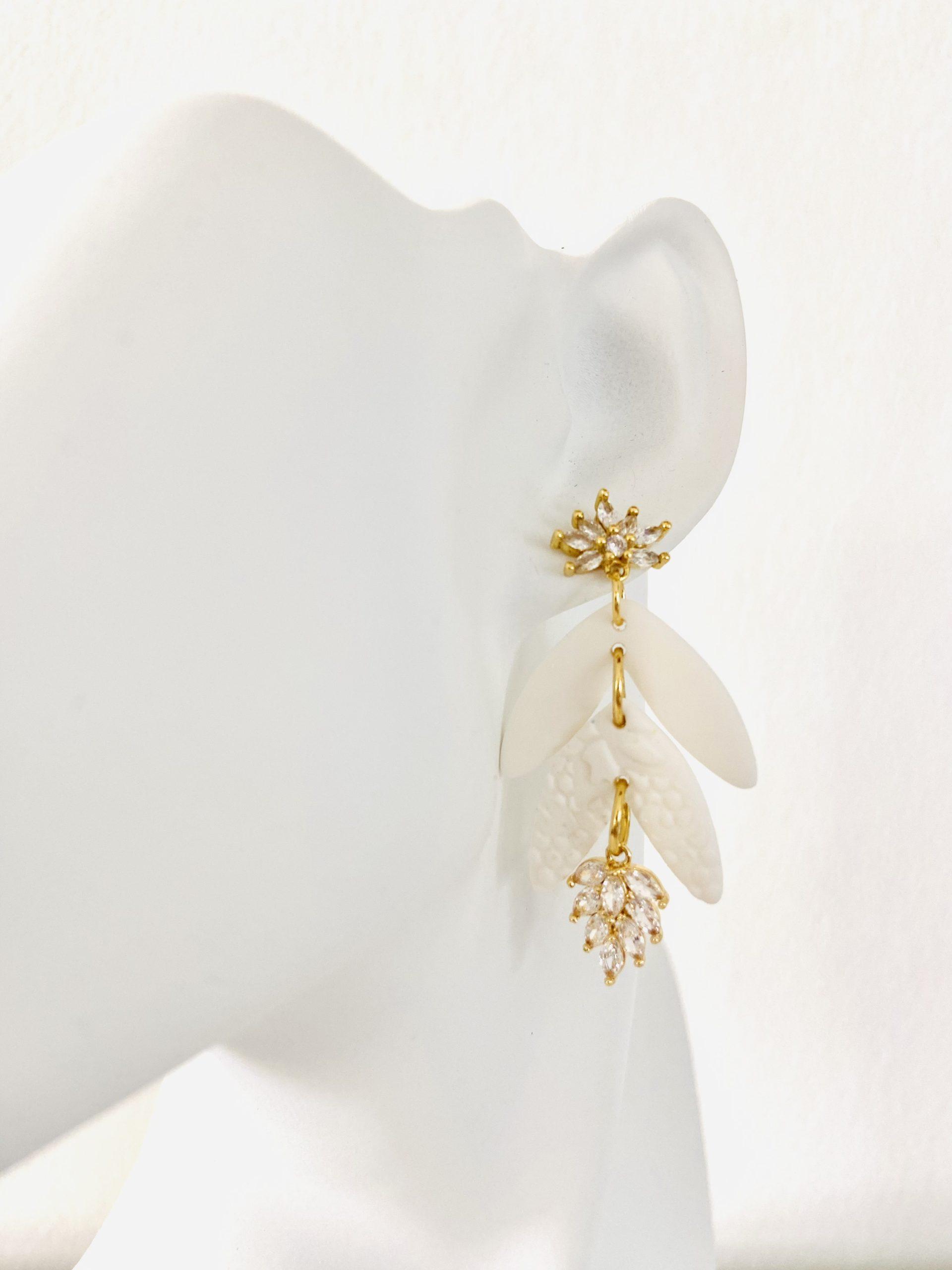 Gold cubic zirconia flower stud with white polymer clay and 18ct gold-plated cubic zirconia leaf pendant.