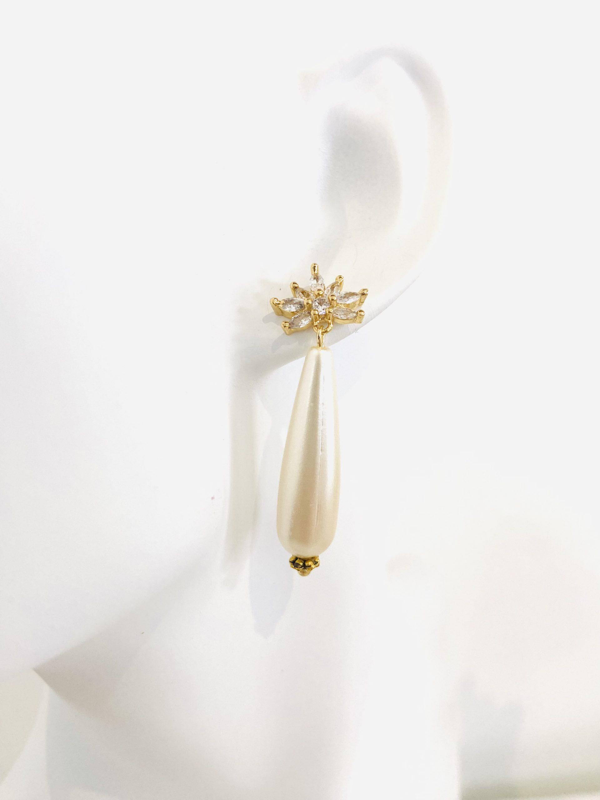 Gold cubic zirconia flower stud with acrylic imitation pearl pendant.
