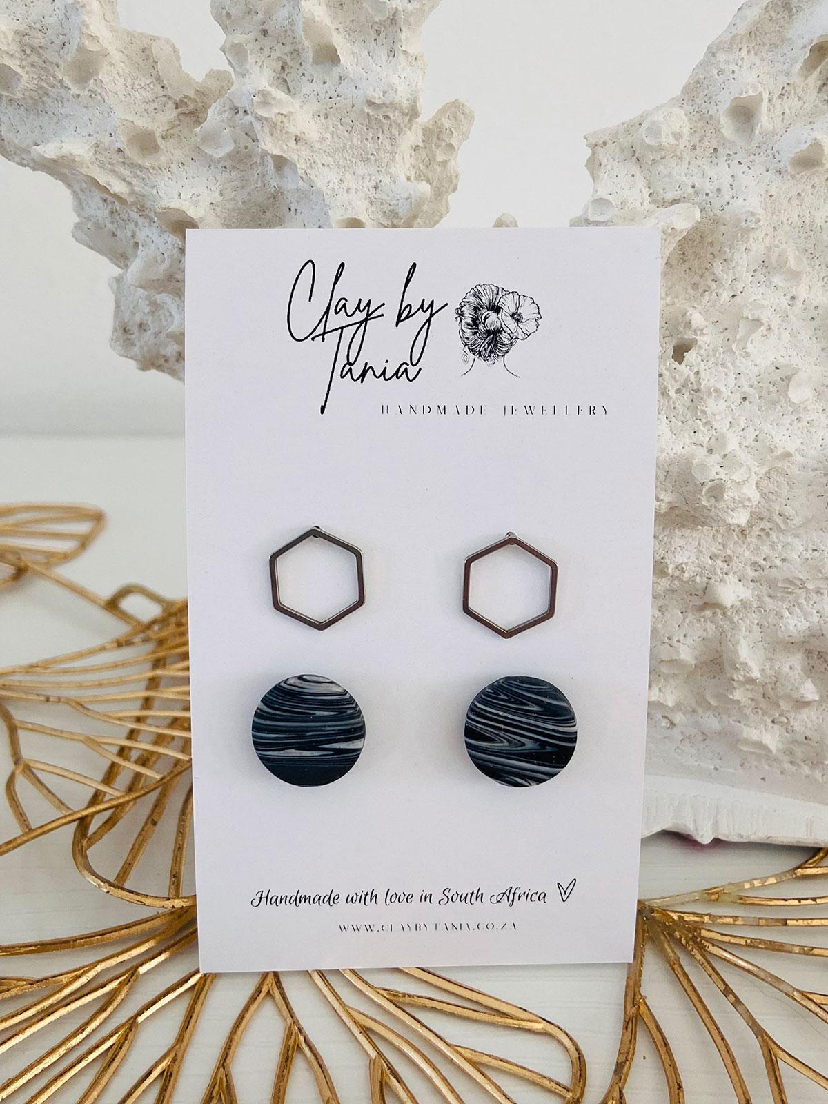 Colour/s: Silver metal hexagon stud & black and white stud