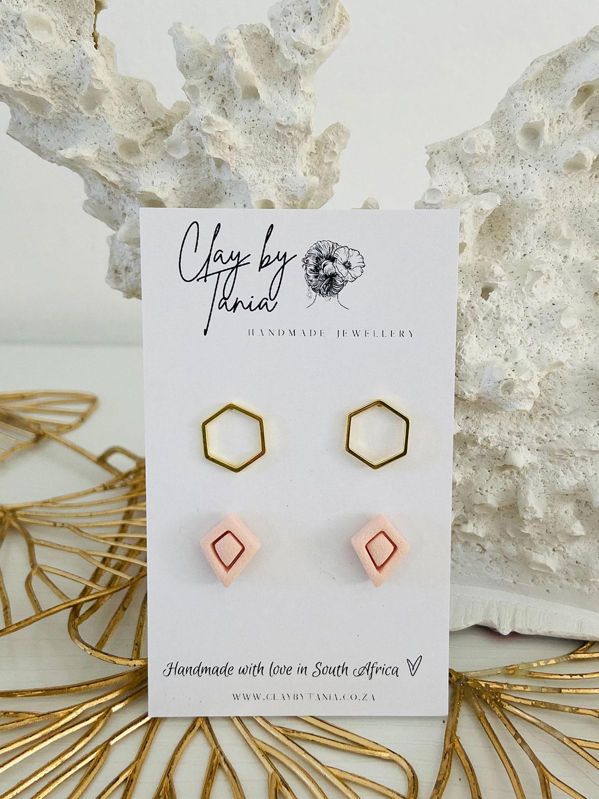 Colour/s: Gold metal hexagon stud & light-pink embossed stud