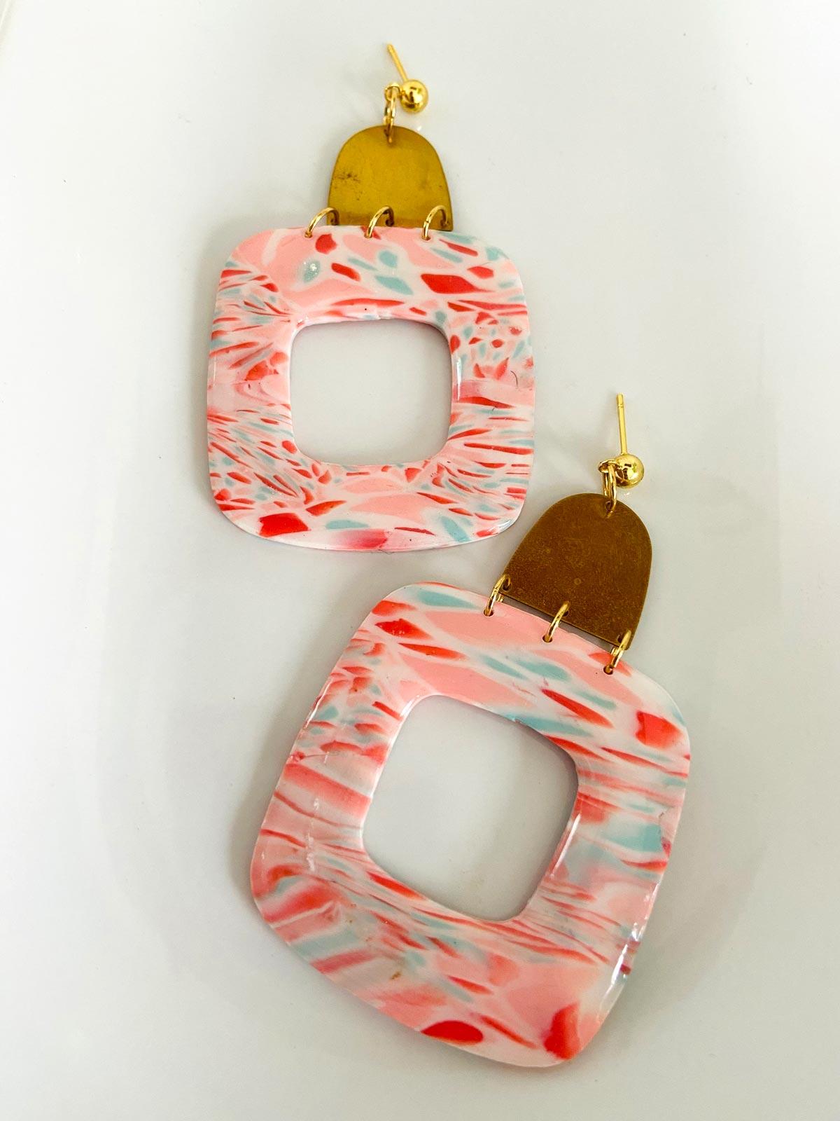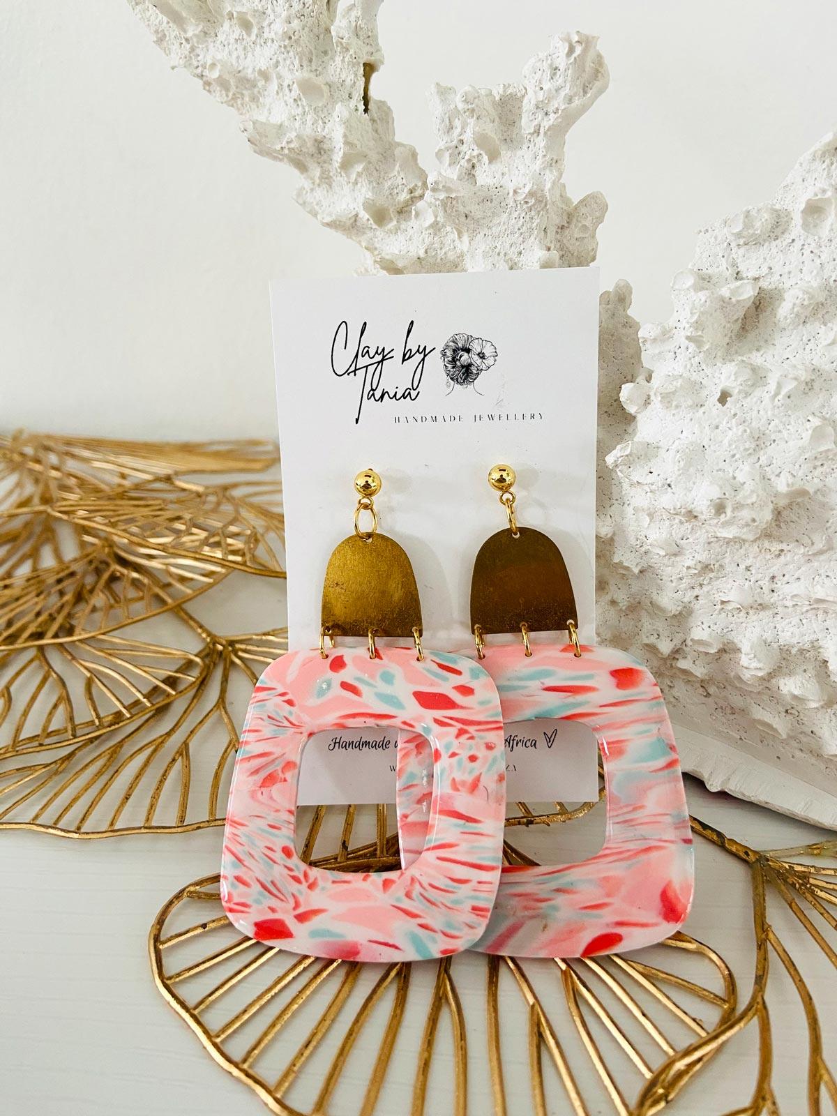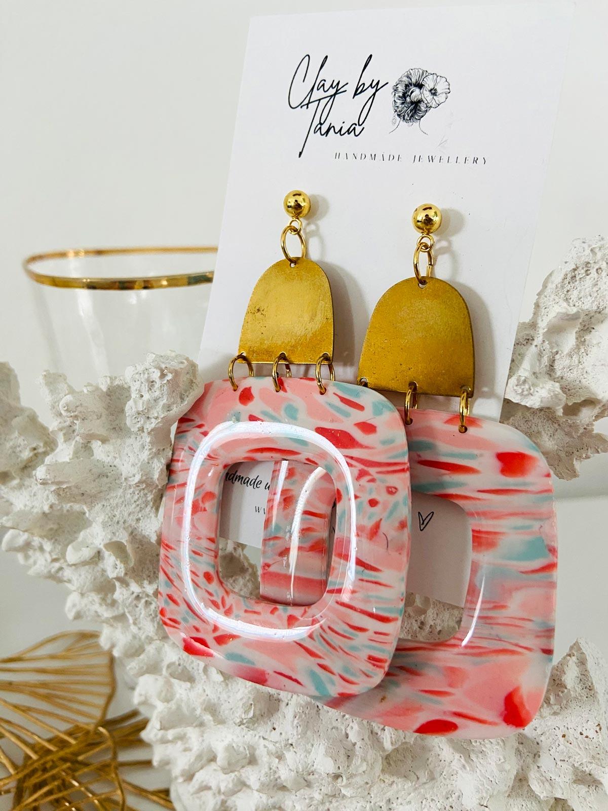 Colour/s: Coral, white, blue. Extra large rounded square drop with brass metal finding