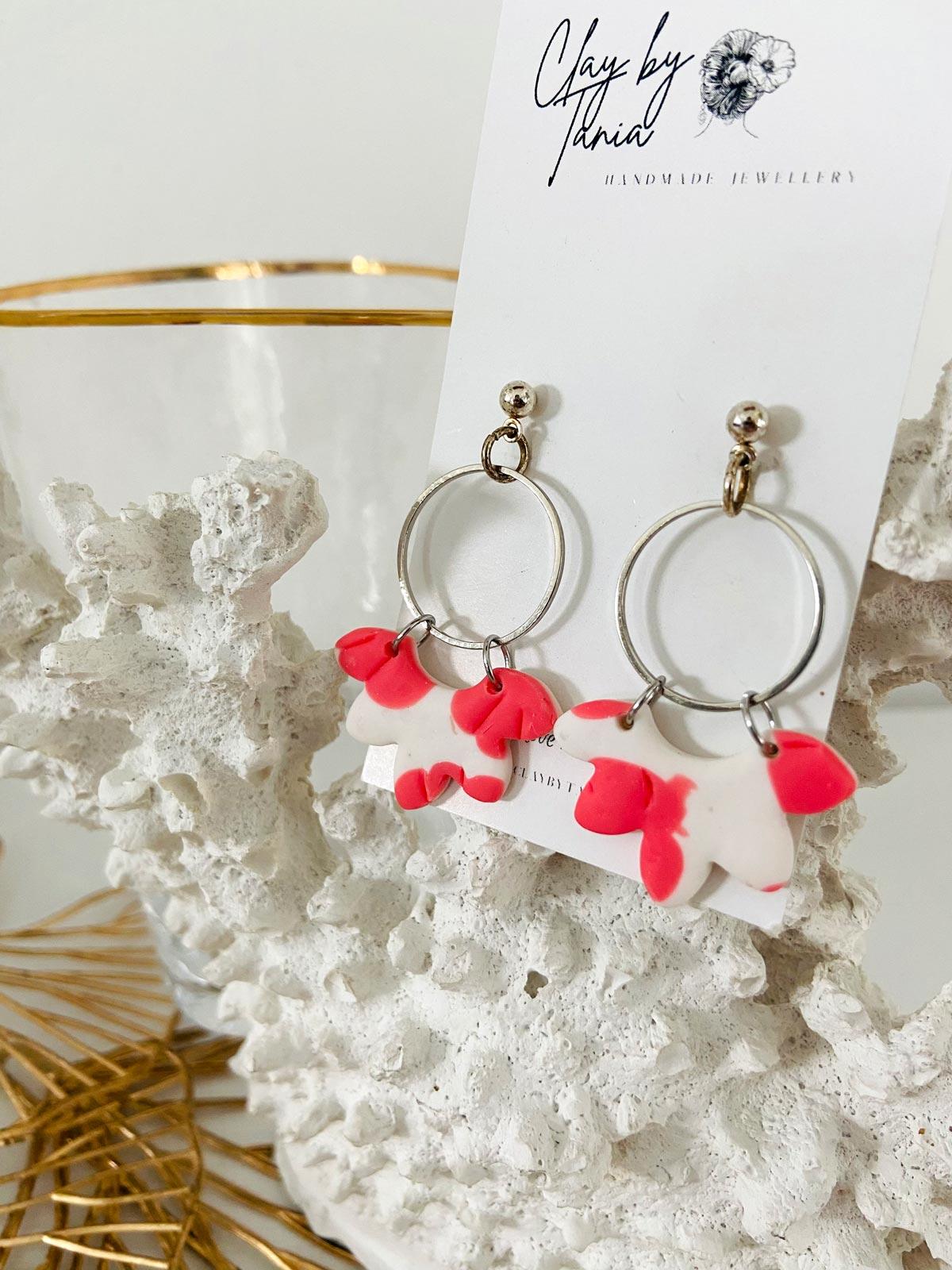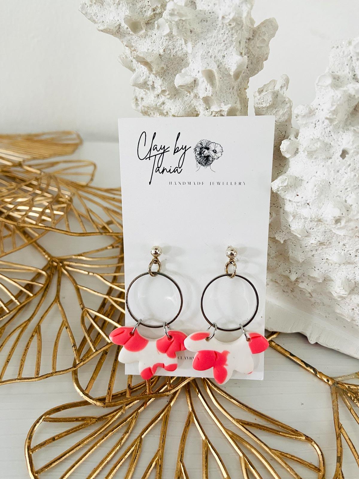 Colour/s: Coral, white. Flower shaped drop with metal connecter