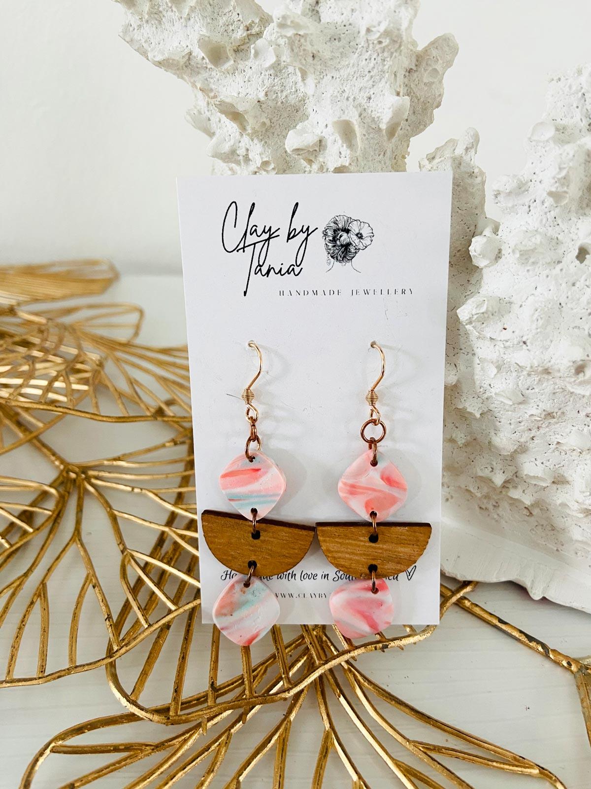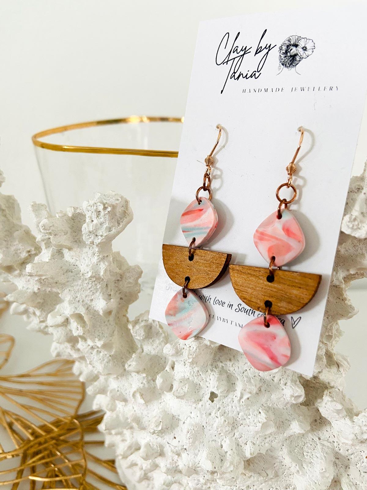Colour/s: Coral, white, blue. Three-tier drop with wooden connecter