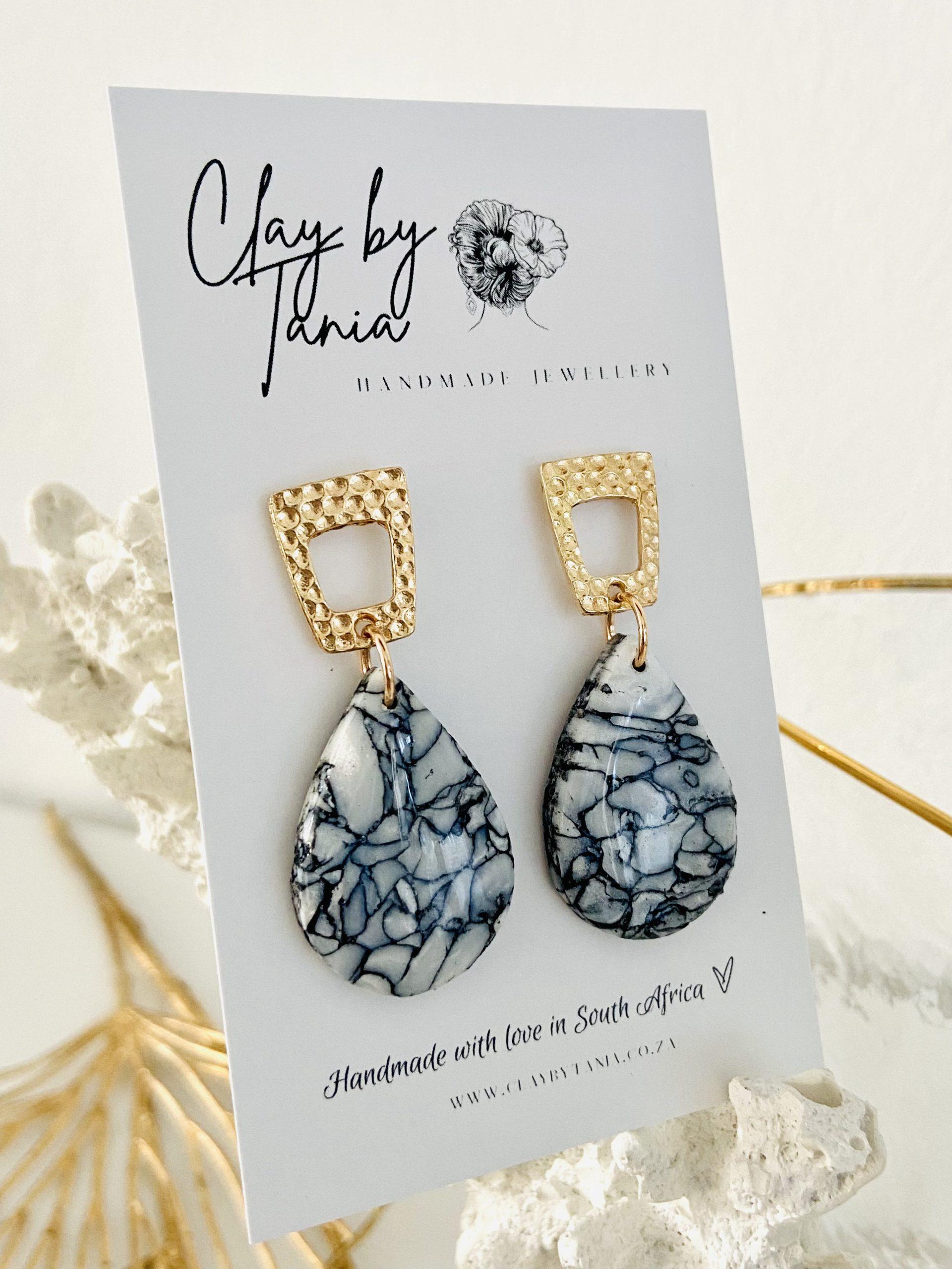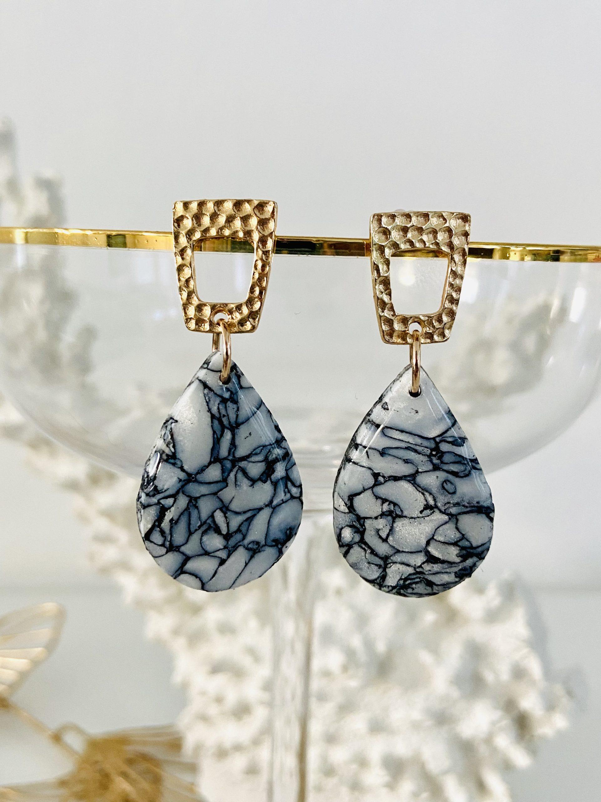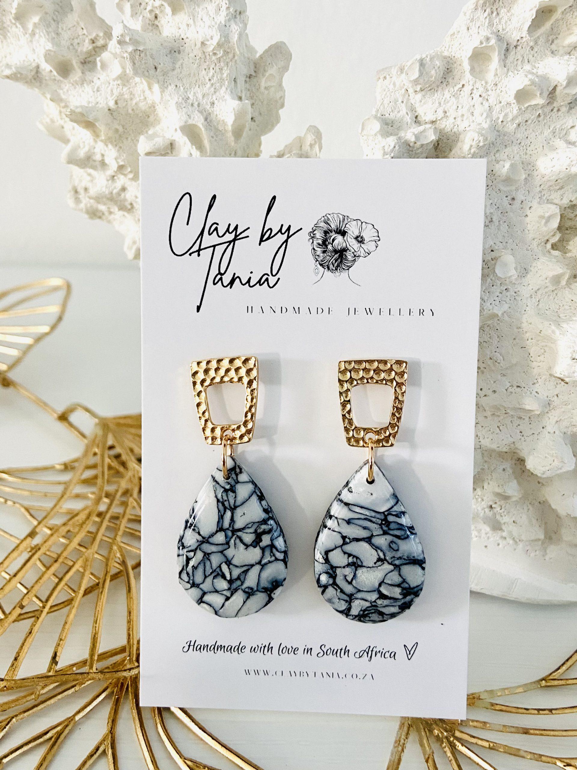 Colour/s: White, black. Faux marble drop with rhombus cut-out gold stud.