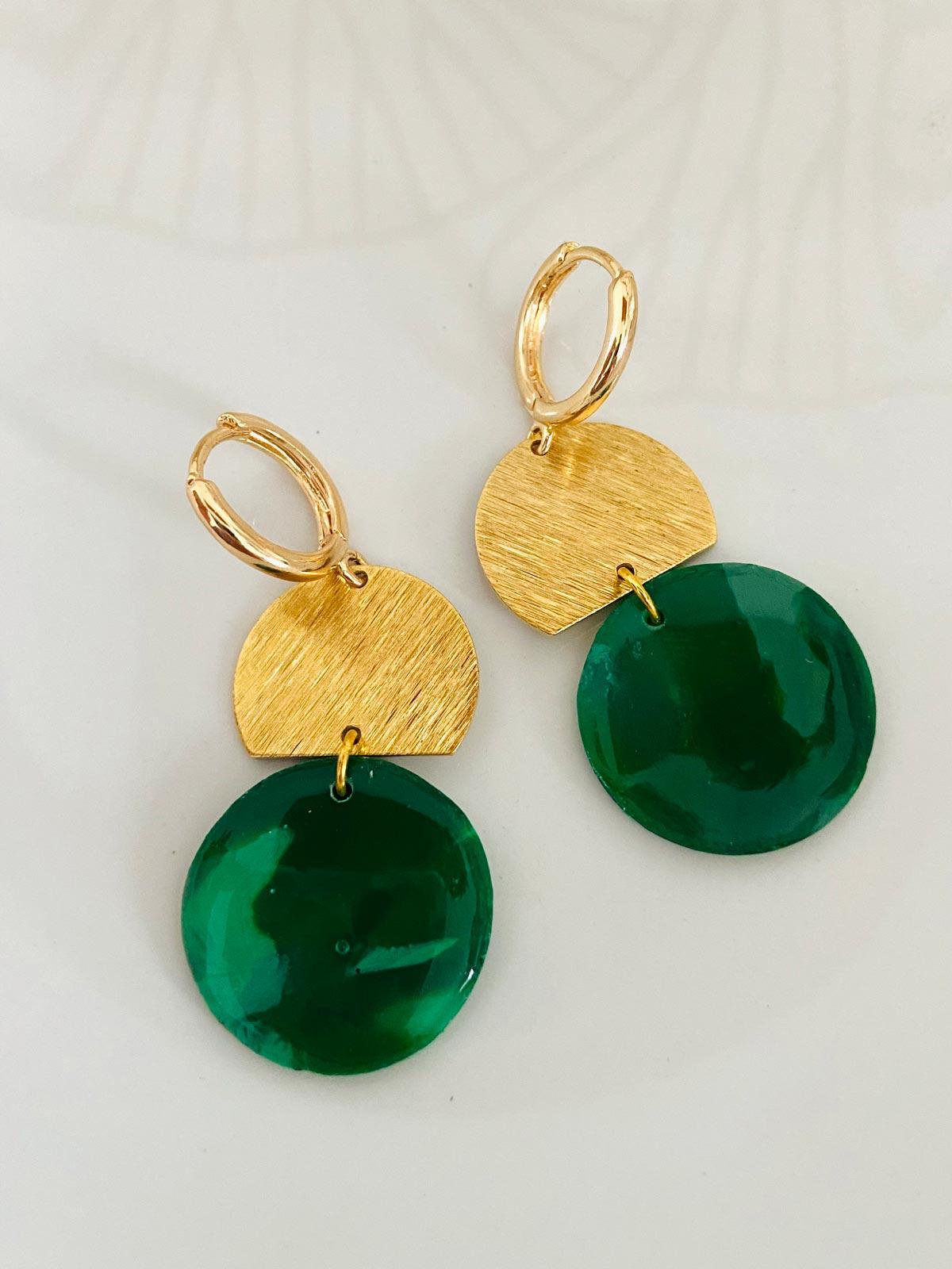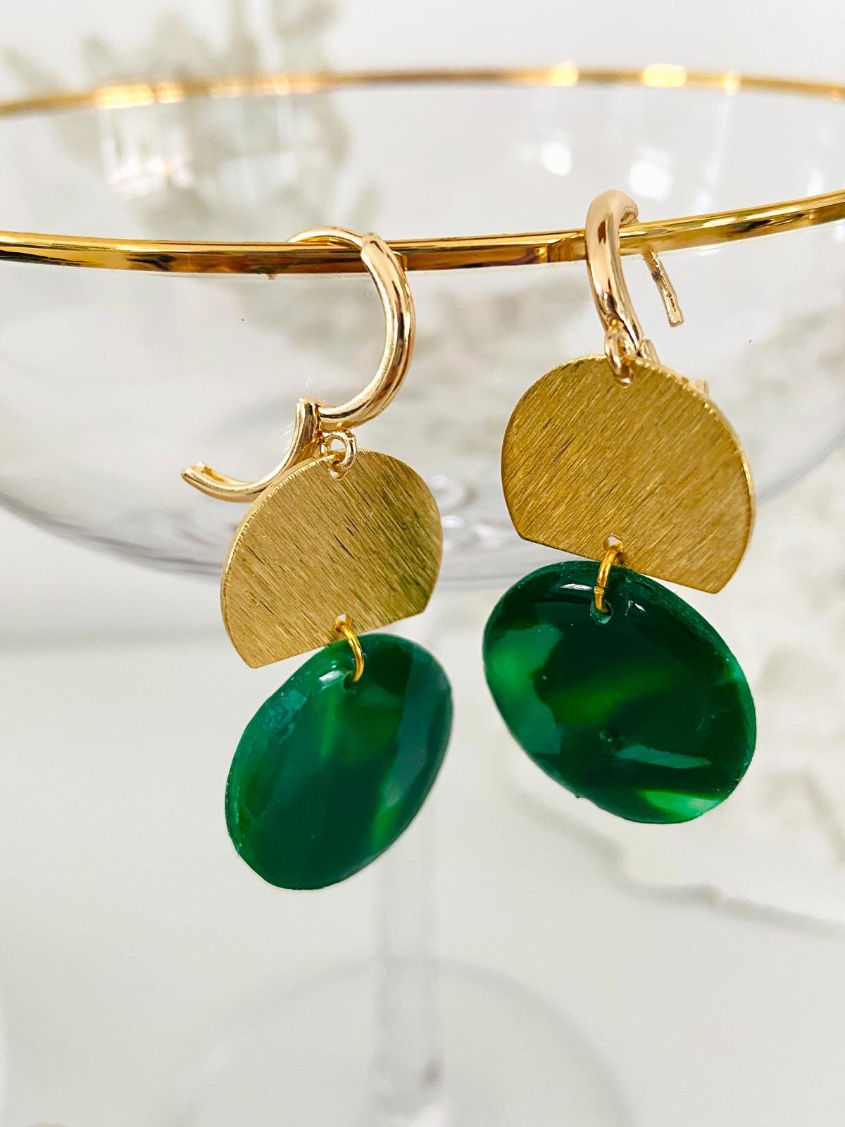 Colour/s: Green, emerald. Gold huggie with gold semi-circle connector and emerald green circle