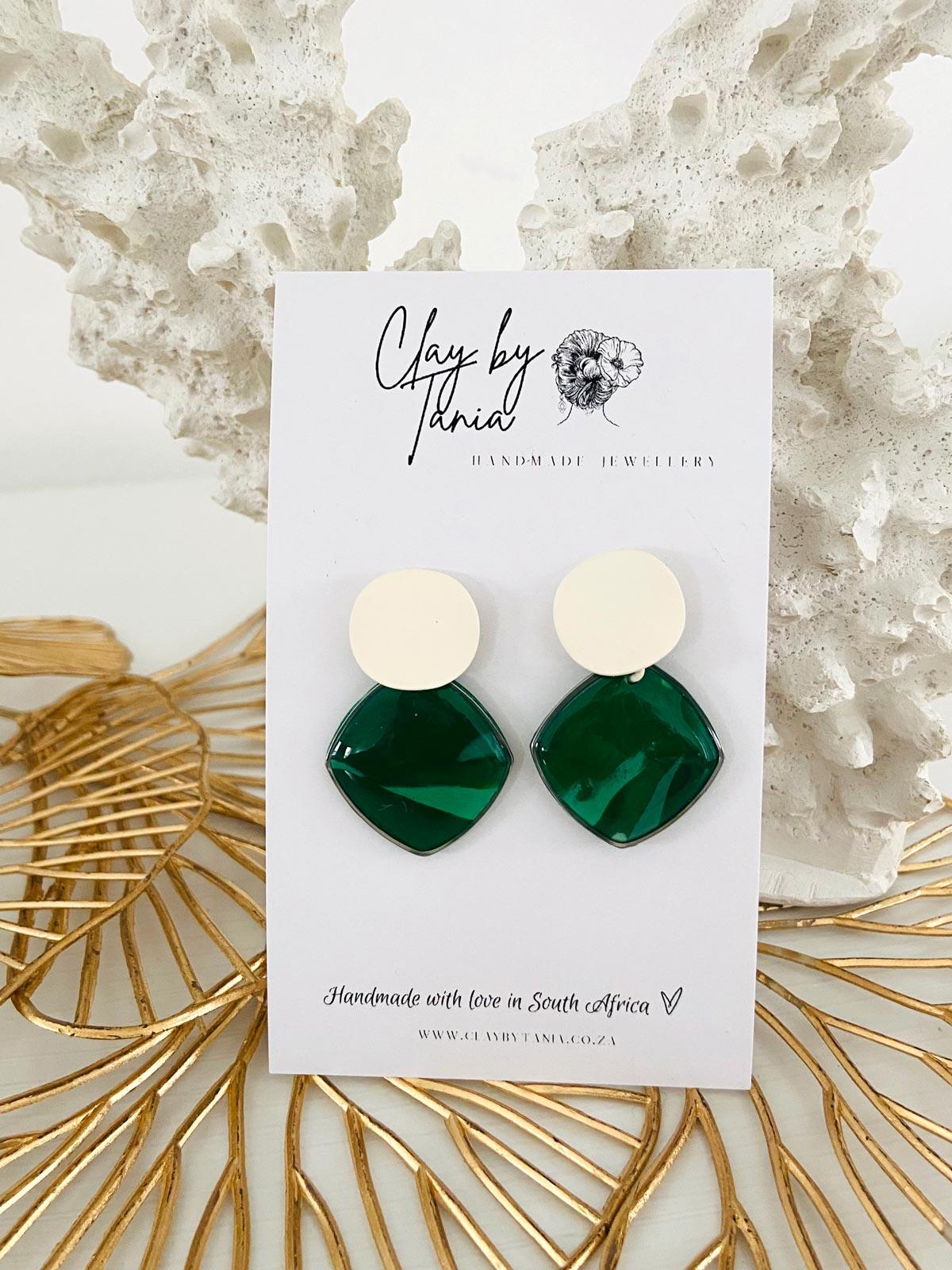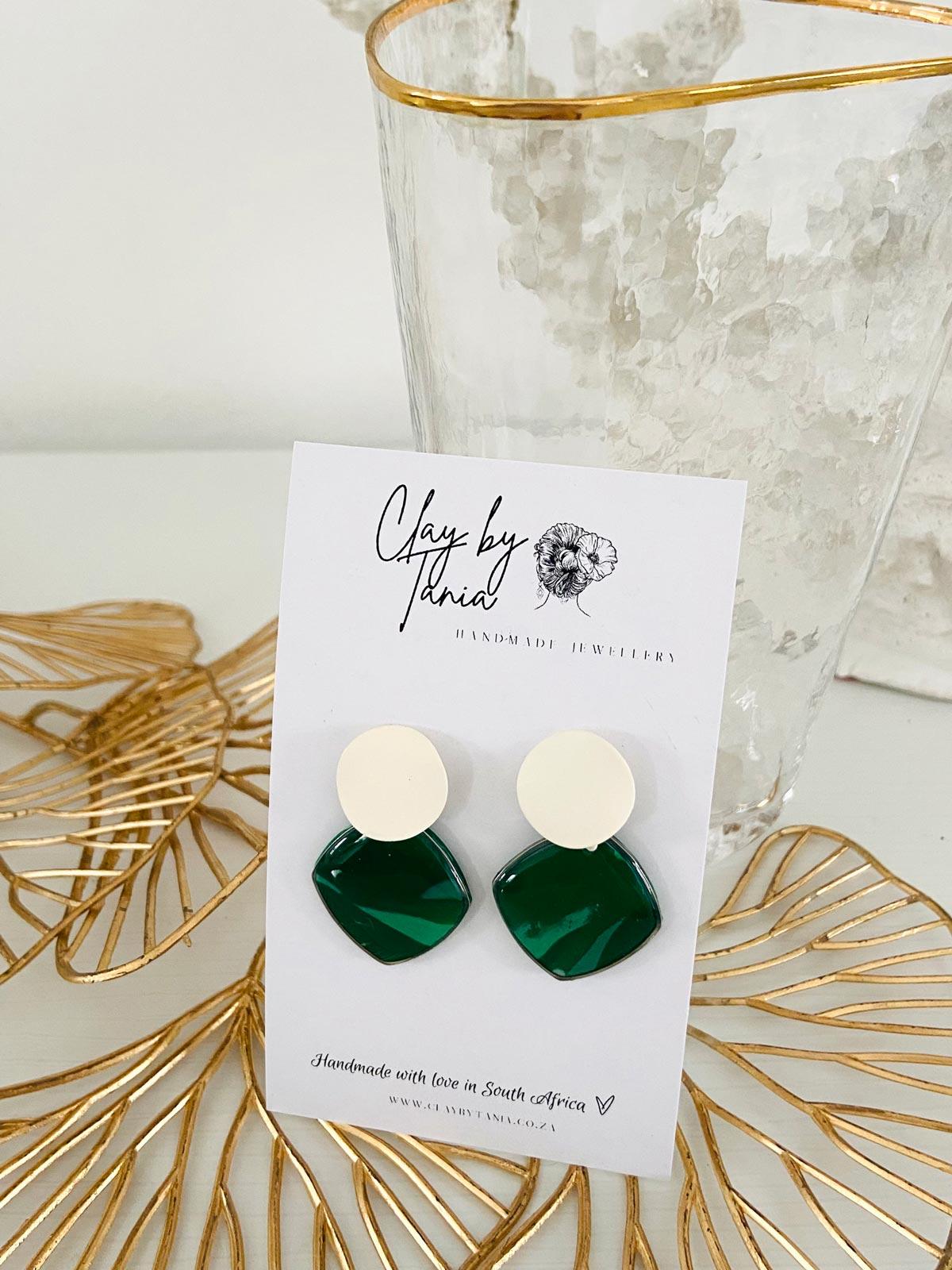 Colour/s: Green, emerald. Brushed metal cream stud with emerald green circle pendant