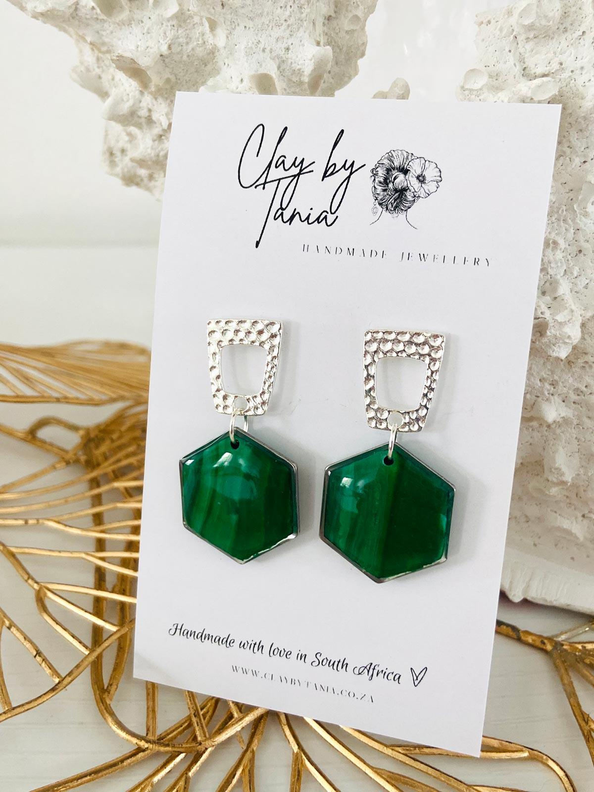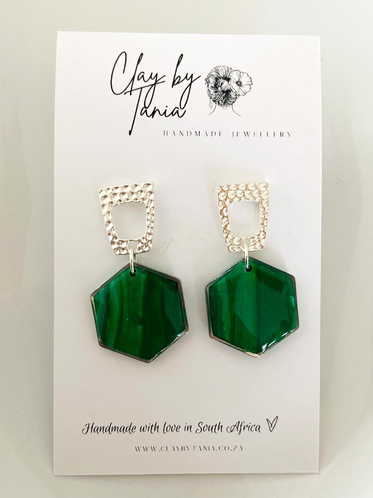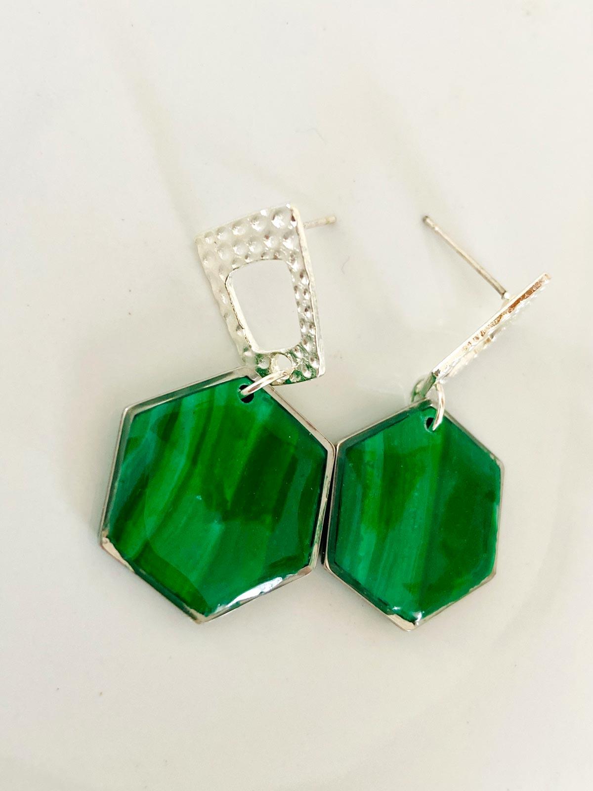 Colour/s: Green, emerald. Silver metal open stud with emerald green circle hexagon