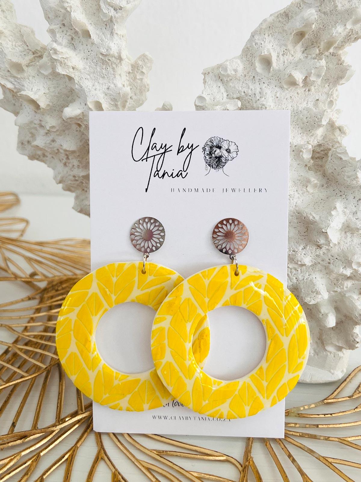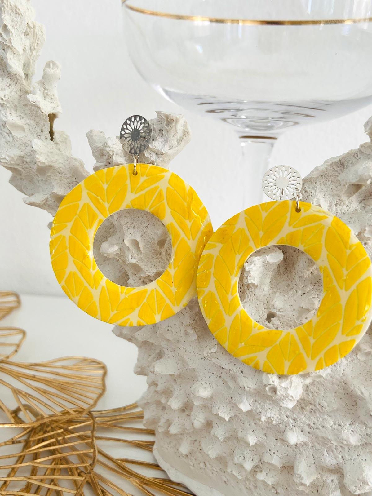 Colour/s: White, yellow, silver. Large leaf pattern circle drop with round silver stud