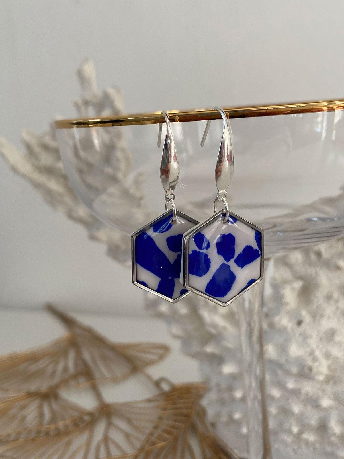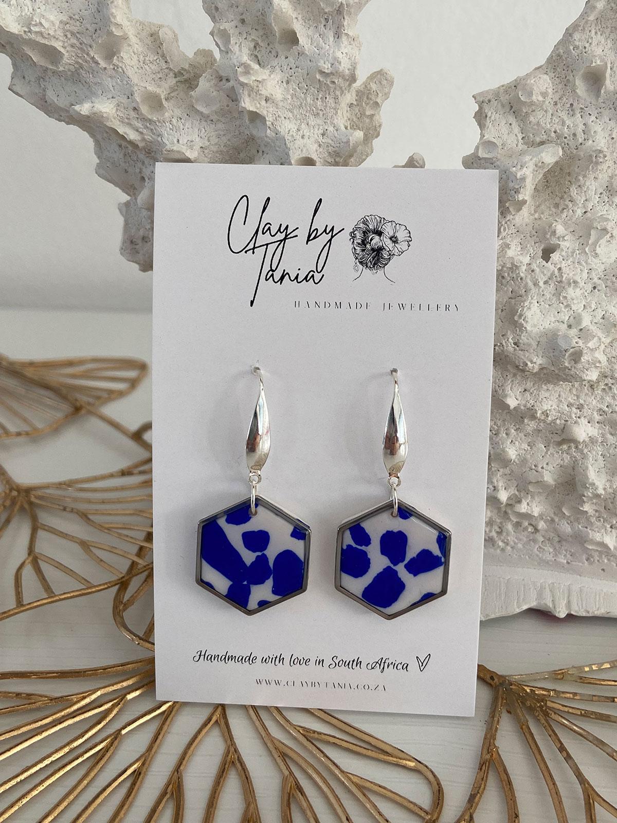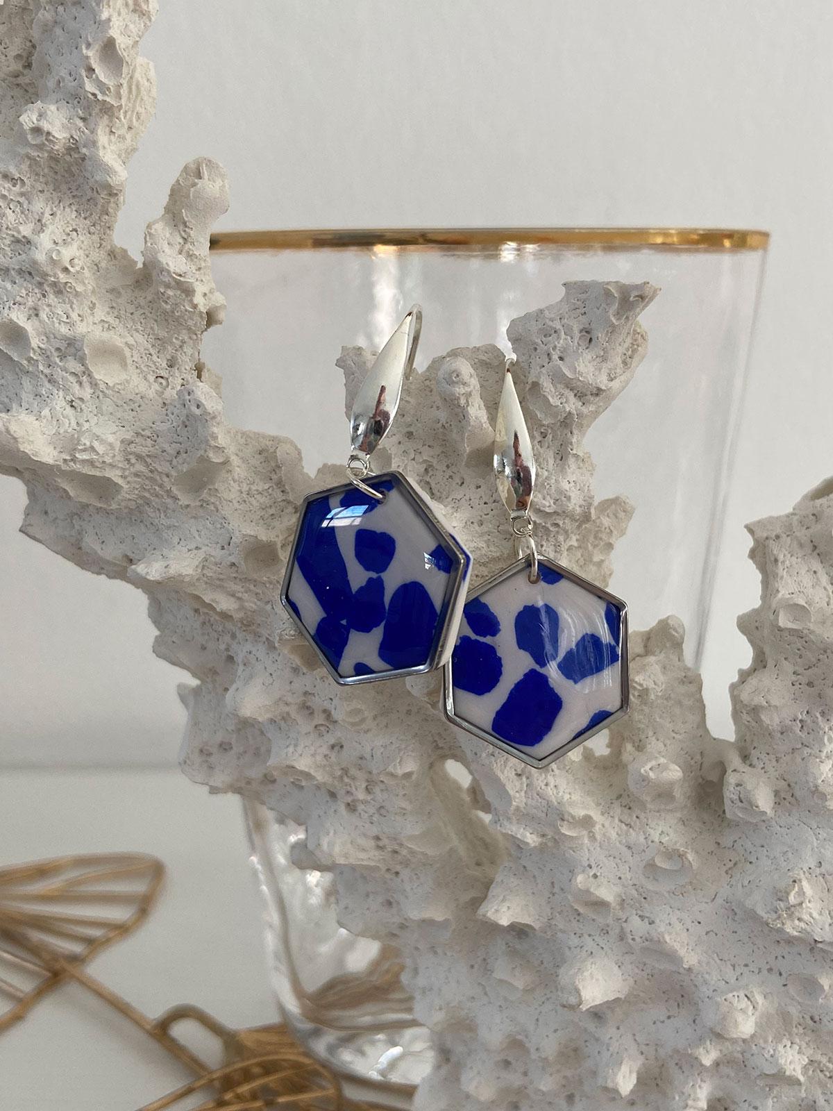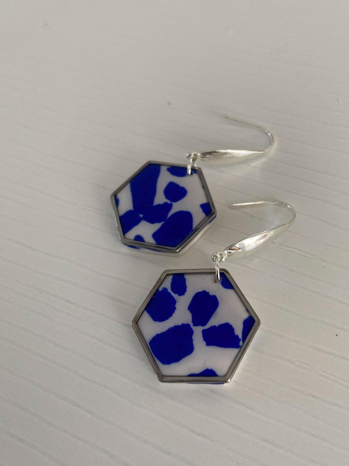 Colour/s: White, blue. Blue and white hexacon stud in metal casing with silver hook