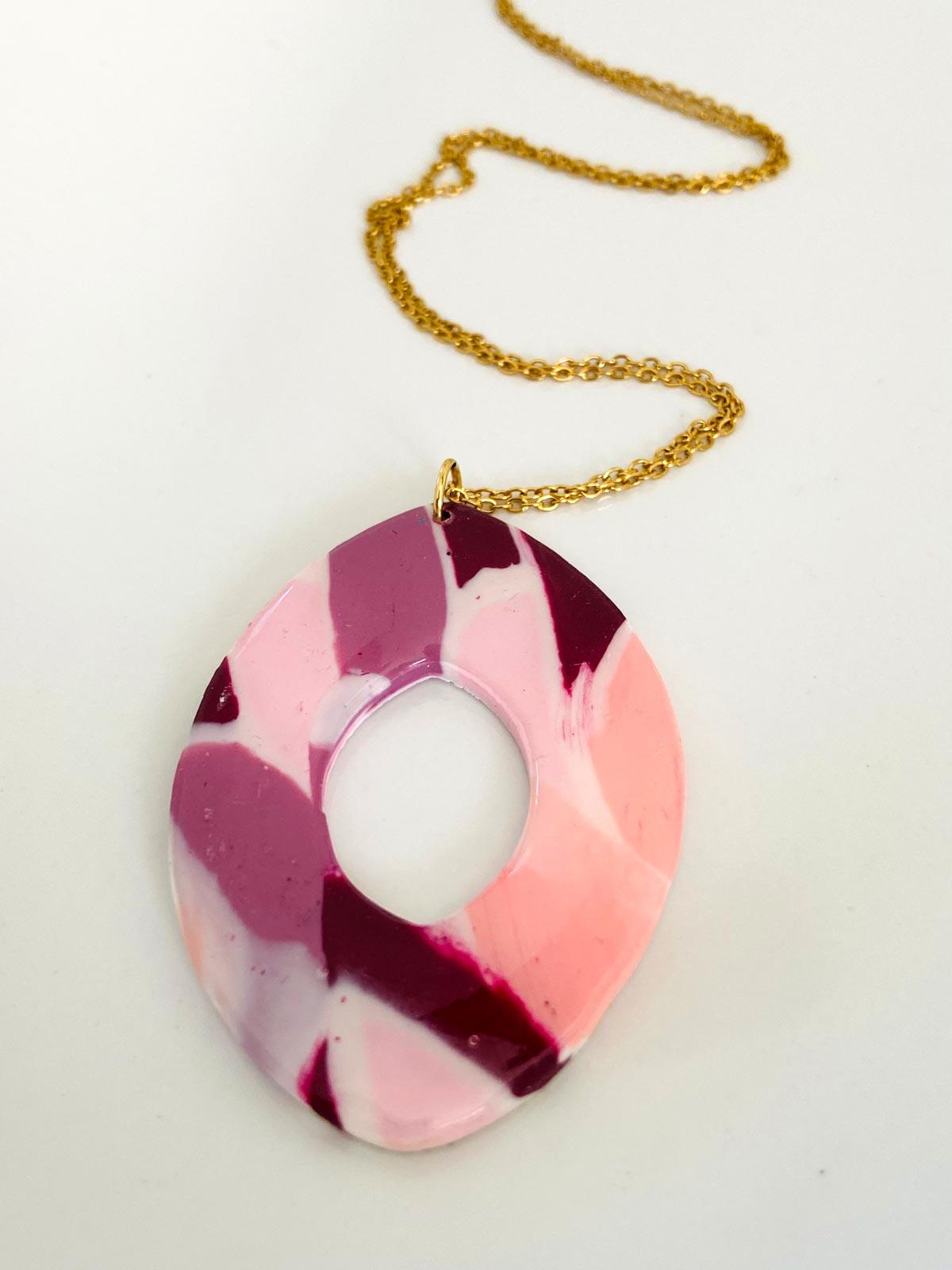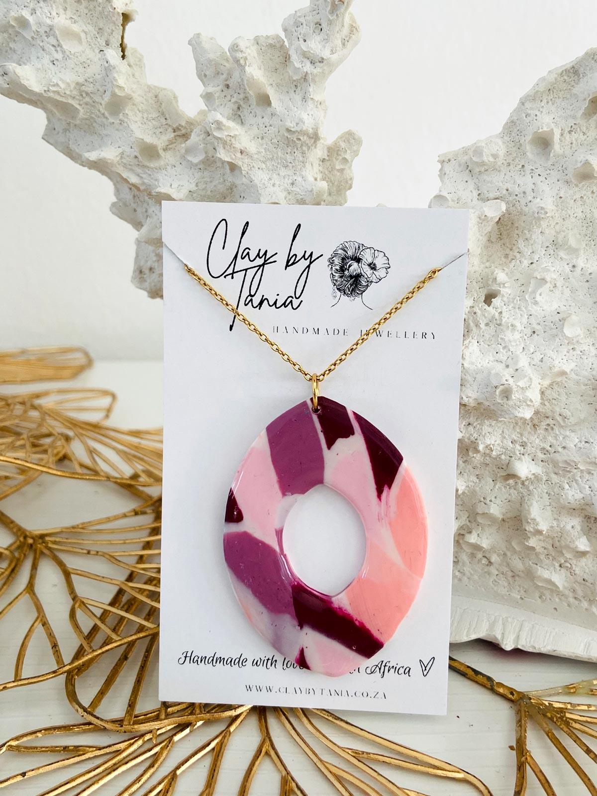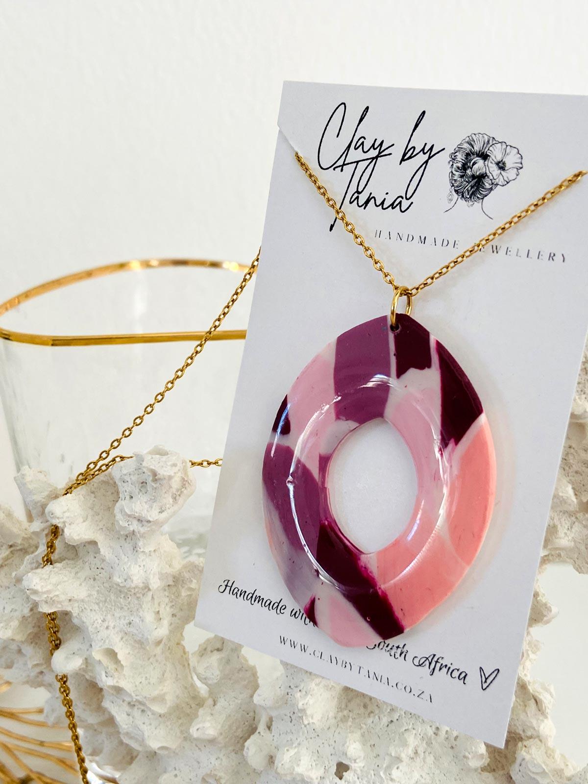 Colour/s: Purple, pink, white. Gold stainless steel chain with large pendant