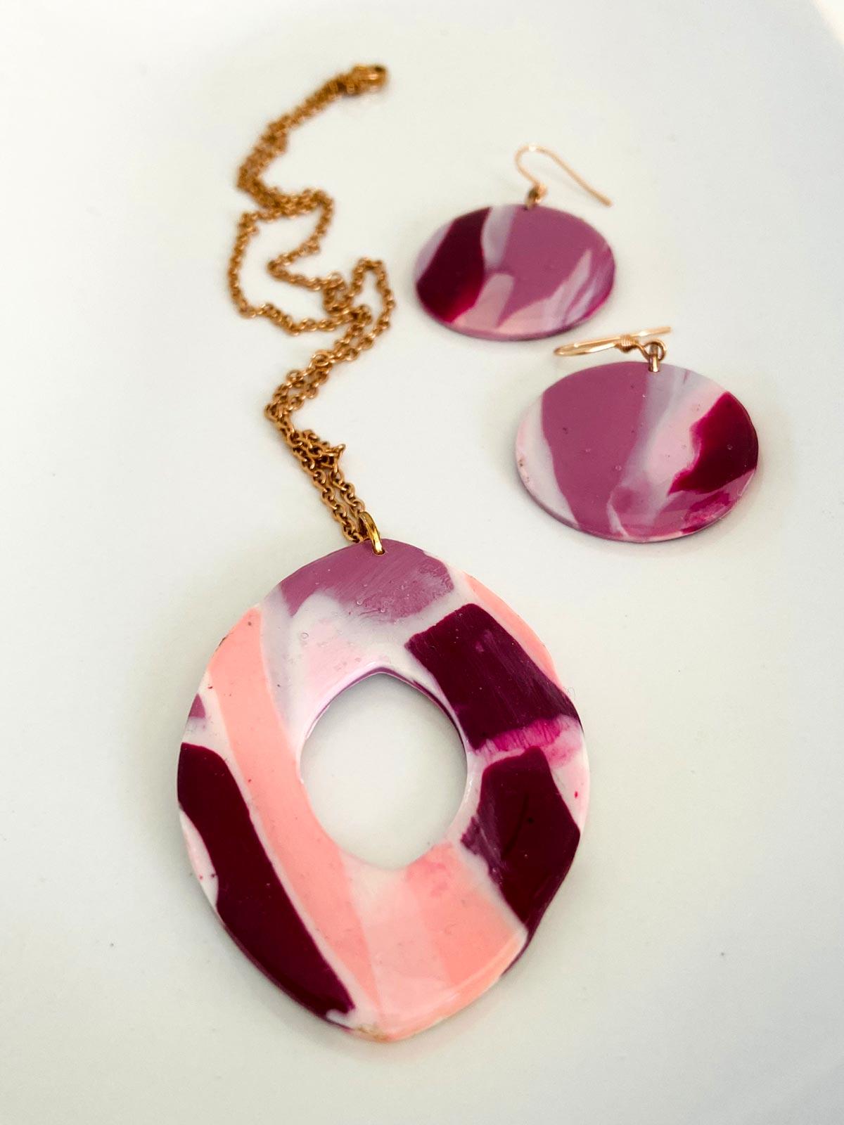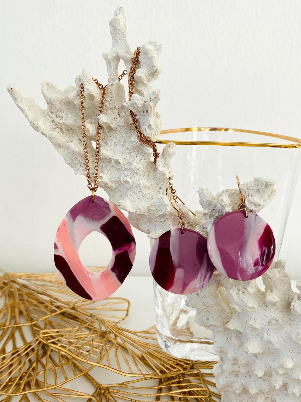 Colour/s: Purple, pink, white. Rose gold stainless steel chain with large pendant, and medium drop earrings0