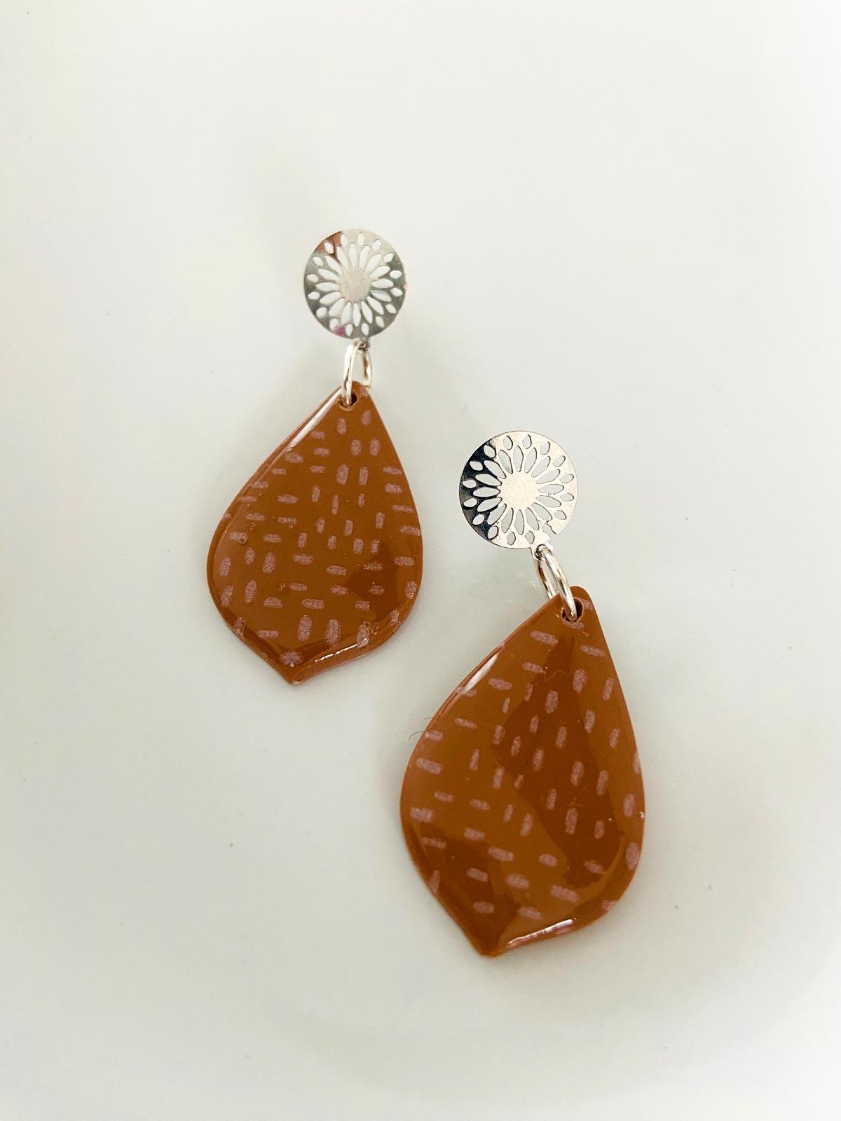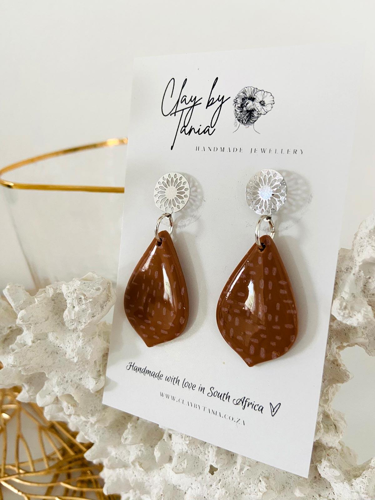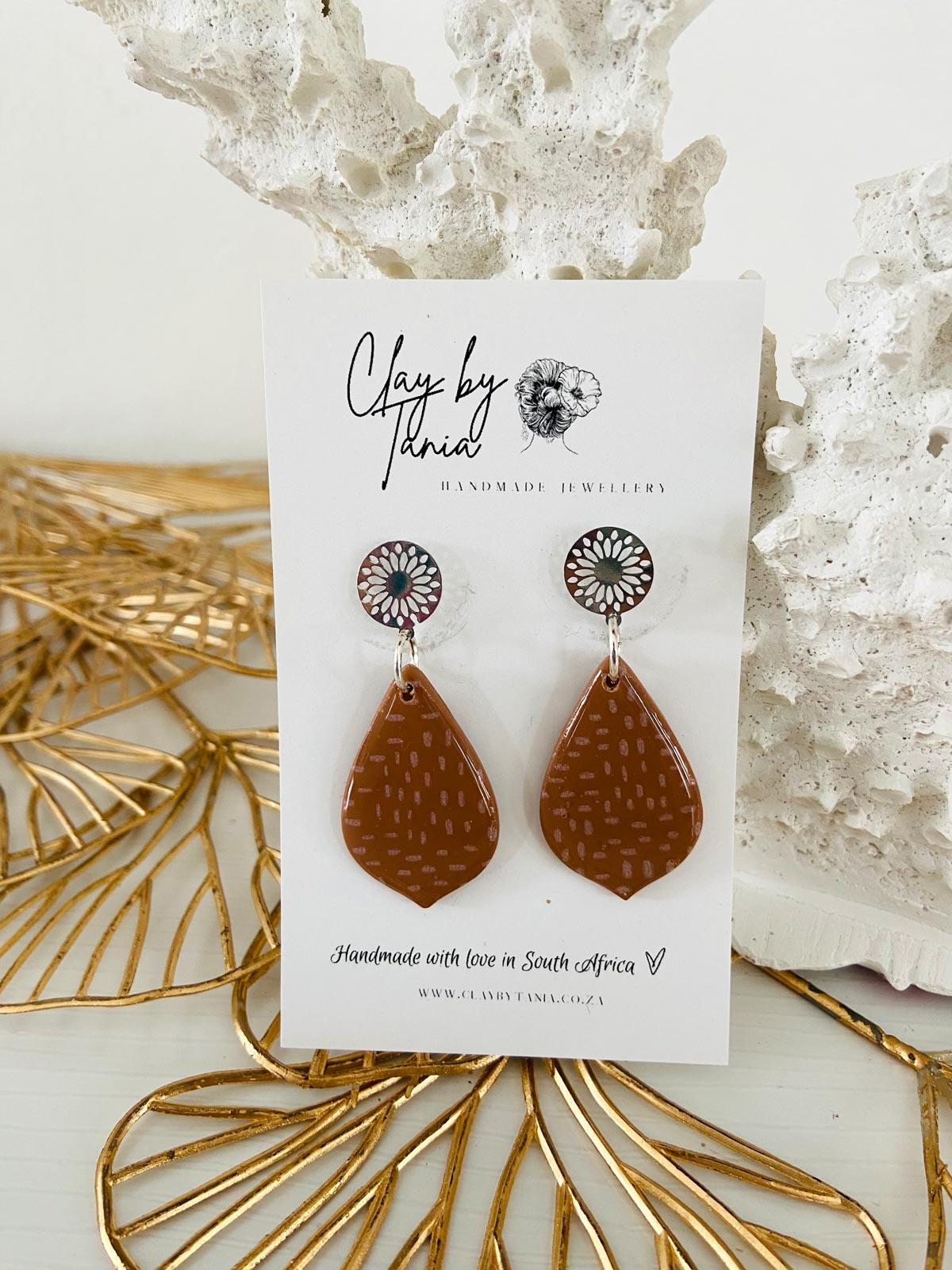 Colour/s: Brown, white. Brown teardrop with round silver stud