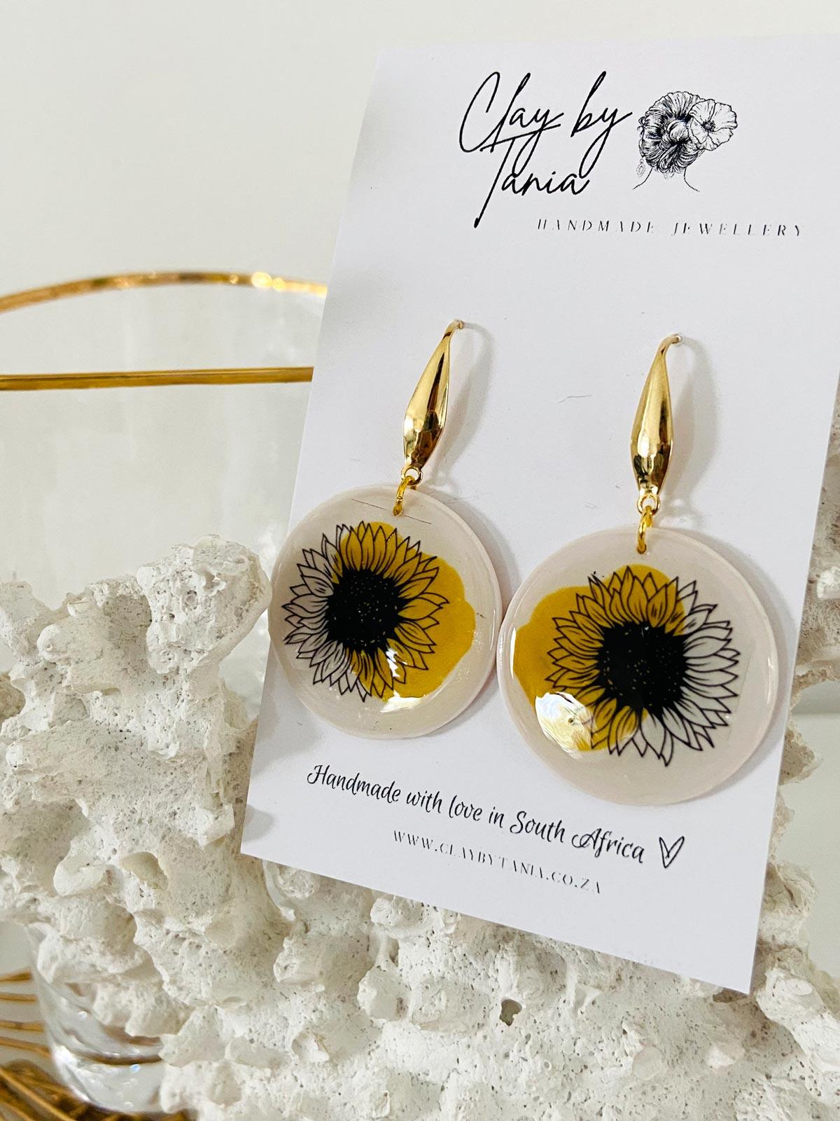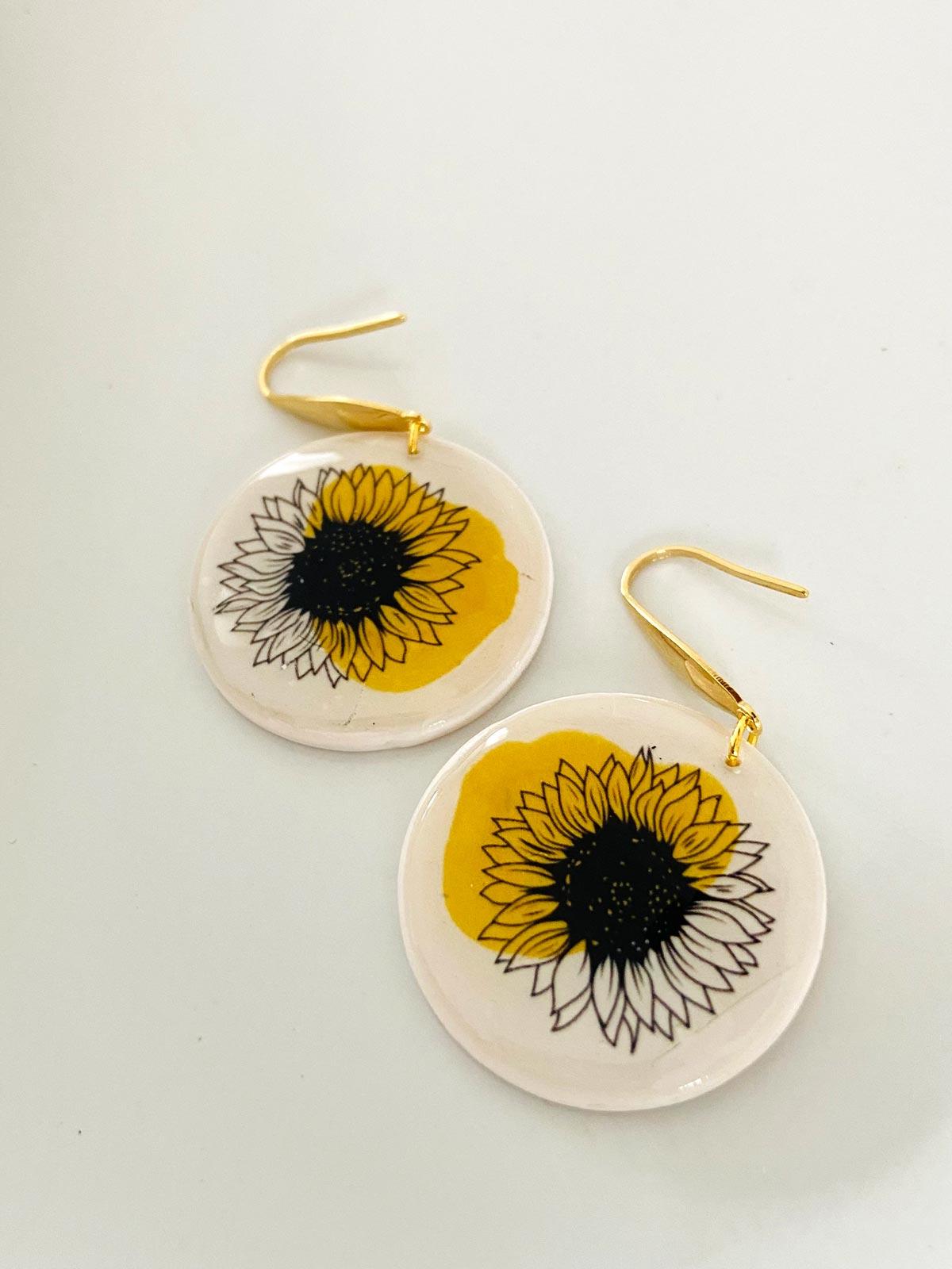 Colour/s: White, brown, yellow. White circle drop with sunflower detail and gold findings