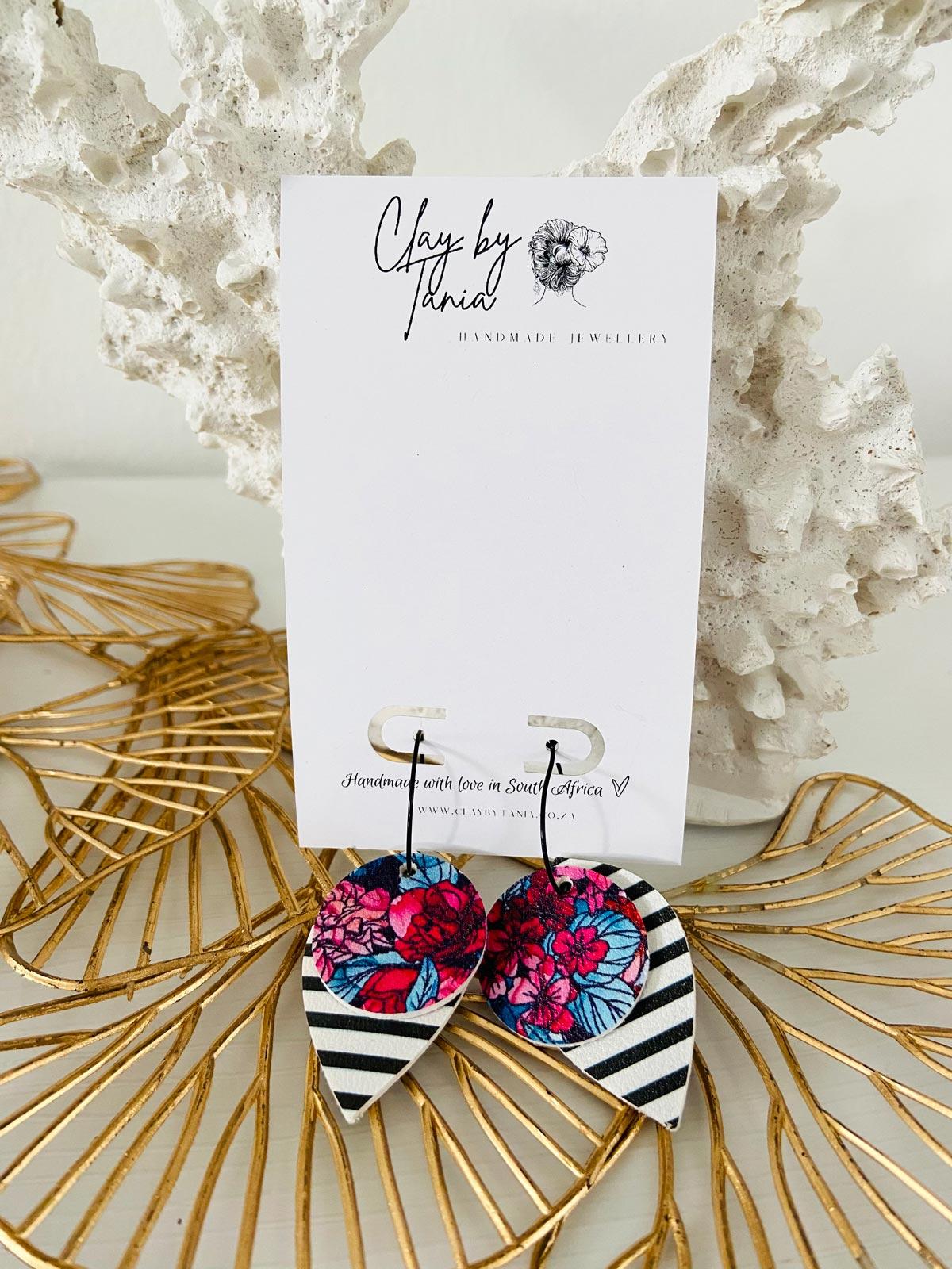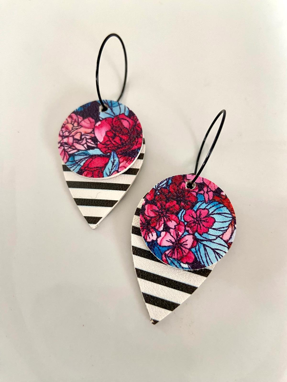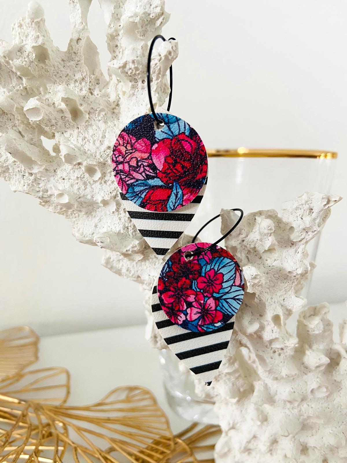 Colour/s: Black, white, floral red and blue. PU Leather teardrop on black hoop