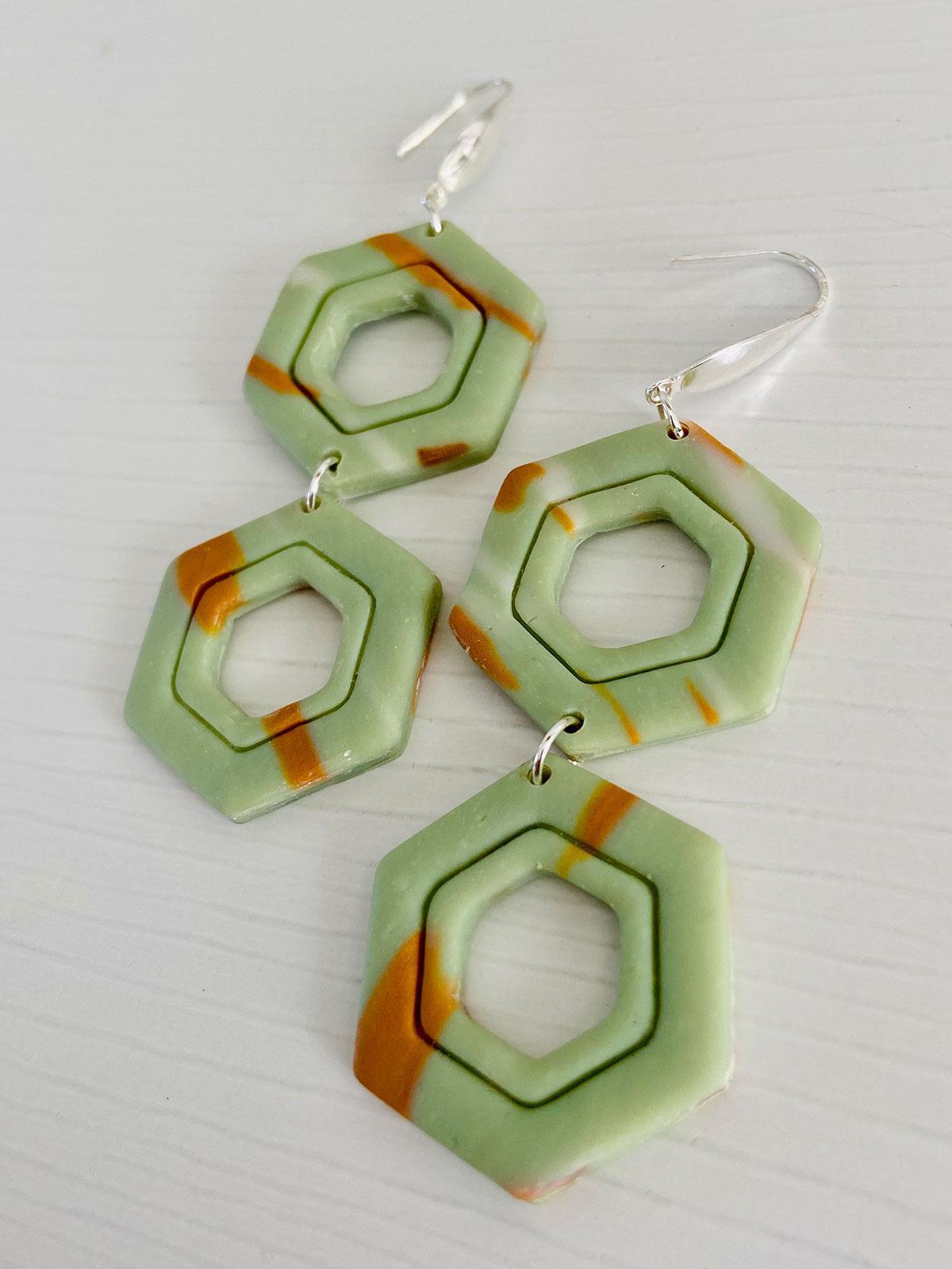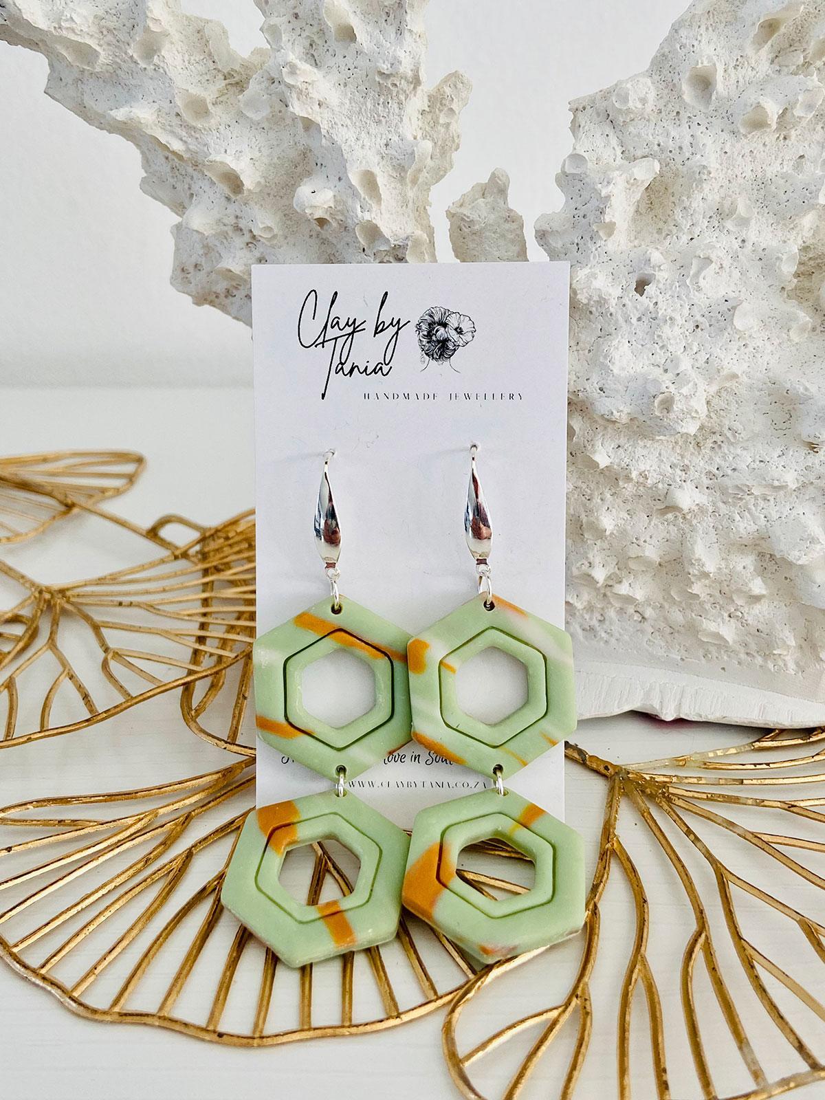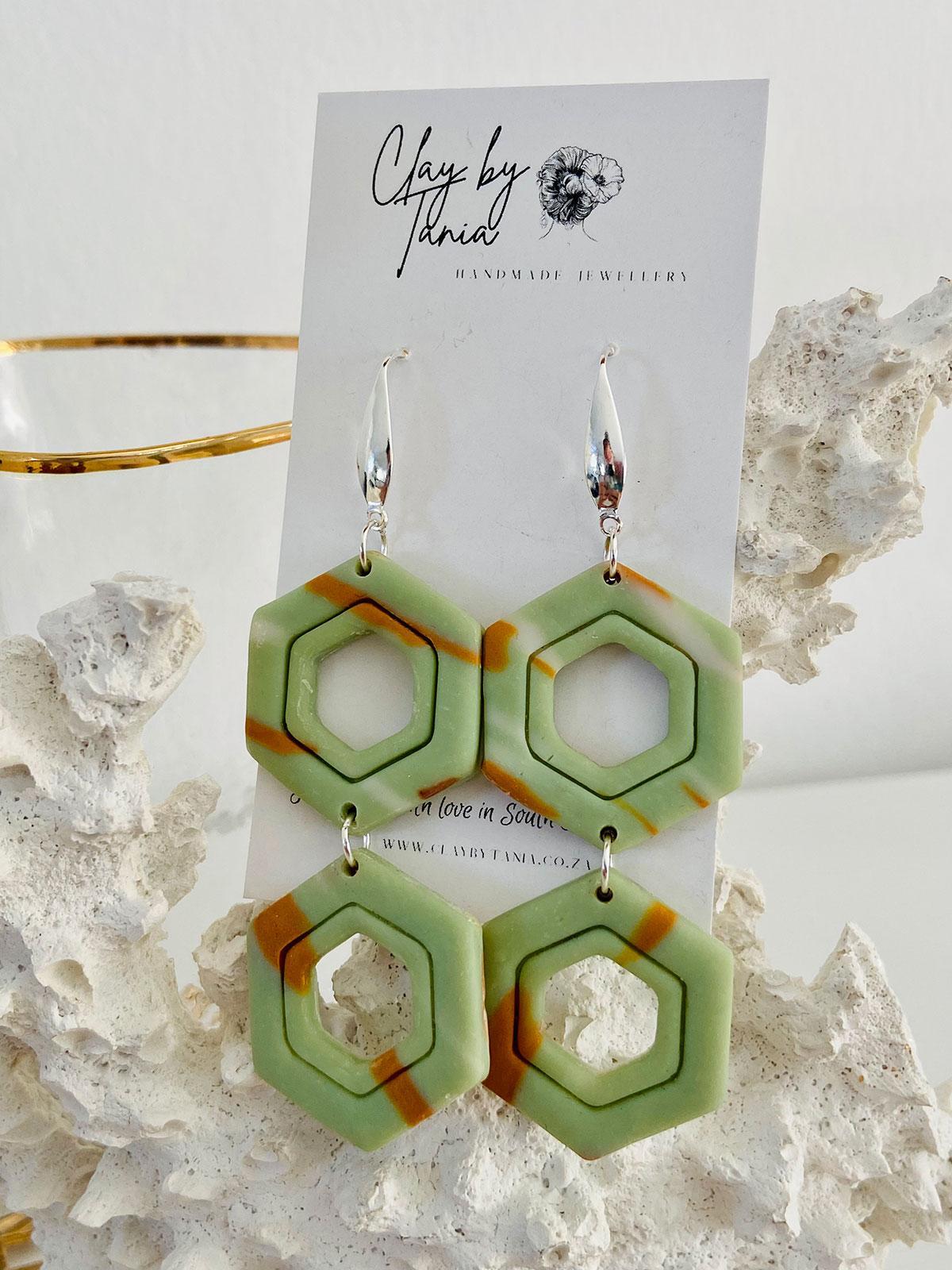 Colour/s: Sage green, caramel, silver. Sage green hexagon drops with silver hook