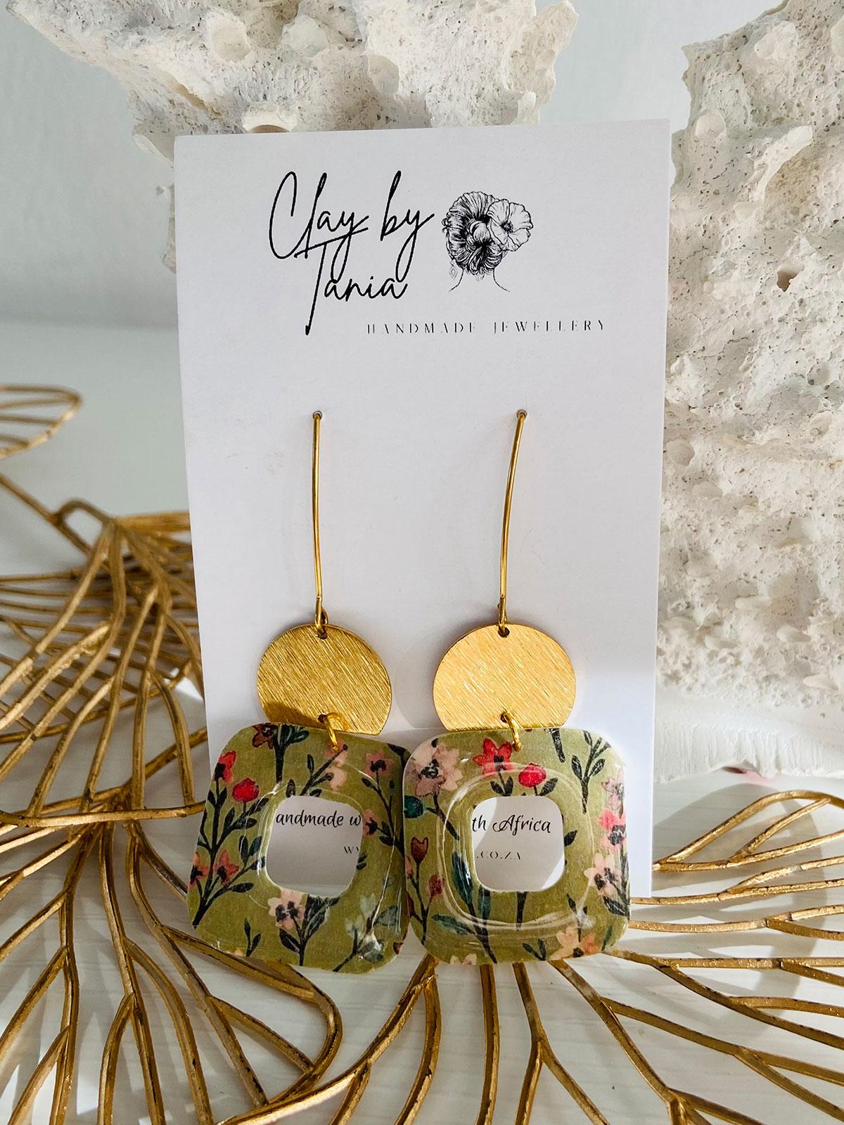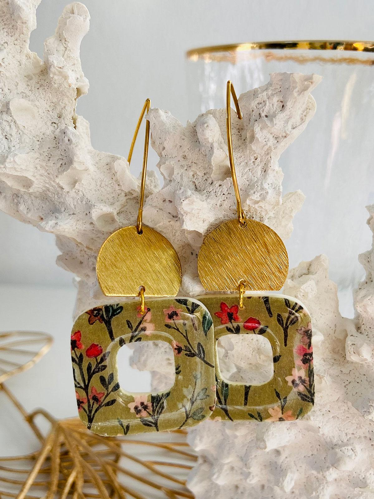 Colour/s: Green, black, red, pink, white. Floral rounded square drop with cut-out and gold semi-circle disc with gold hook