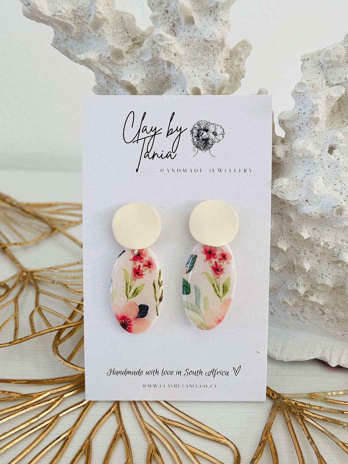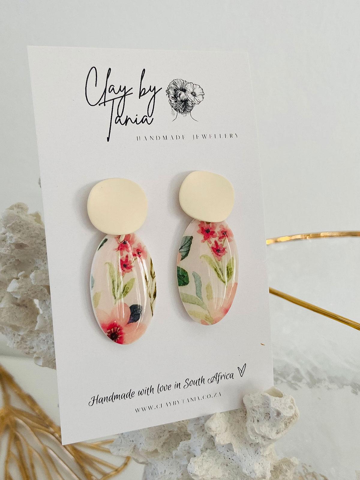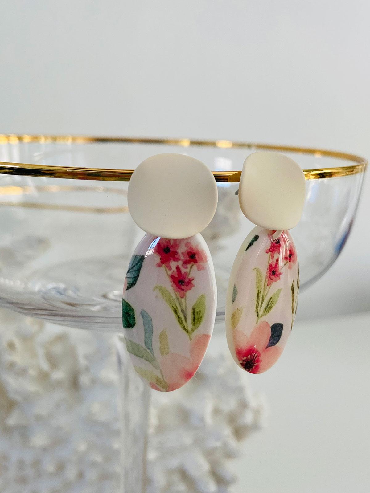 Colour/s: White, pinks, greens. Vintage oval drop with off-white brushed metal stud
